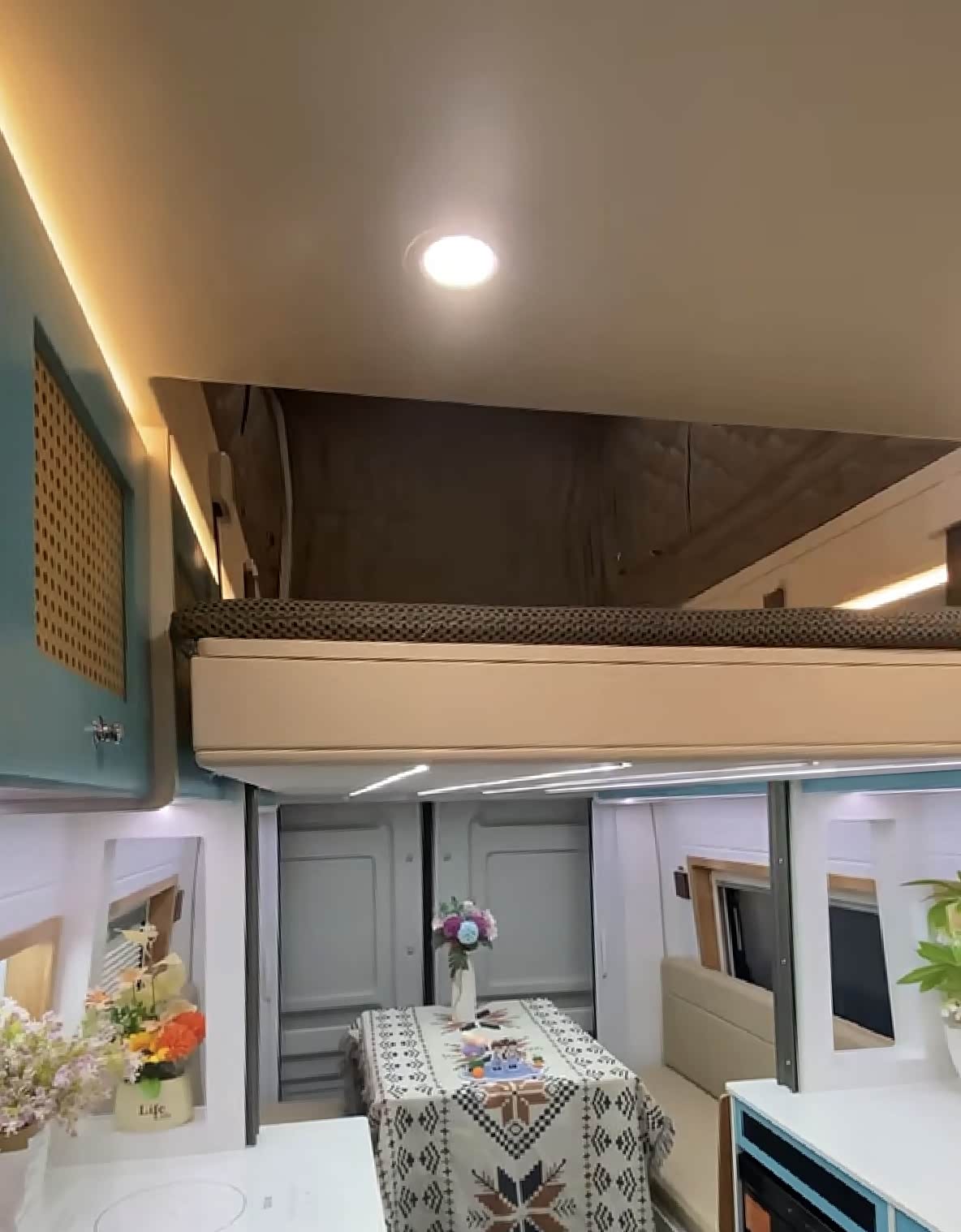 睡觉可以升降床,和我第一台房车一样。那时我就在想如果后置床那里是卡座拼床,尾部有个露台就完美了。升降床可以承重200公斤,可以按键升降和遥控升降1.1*1.9,要是长2米就好了。