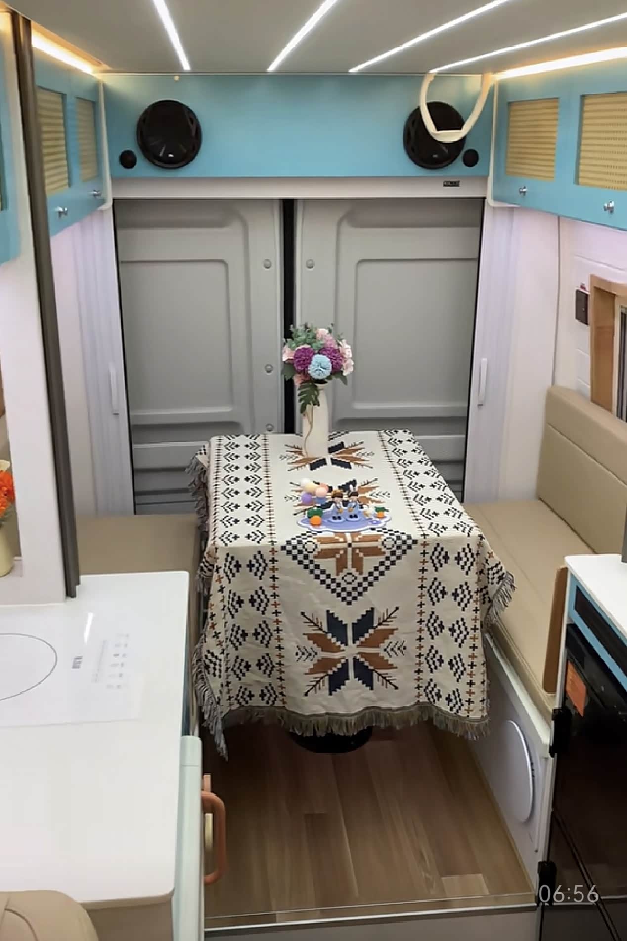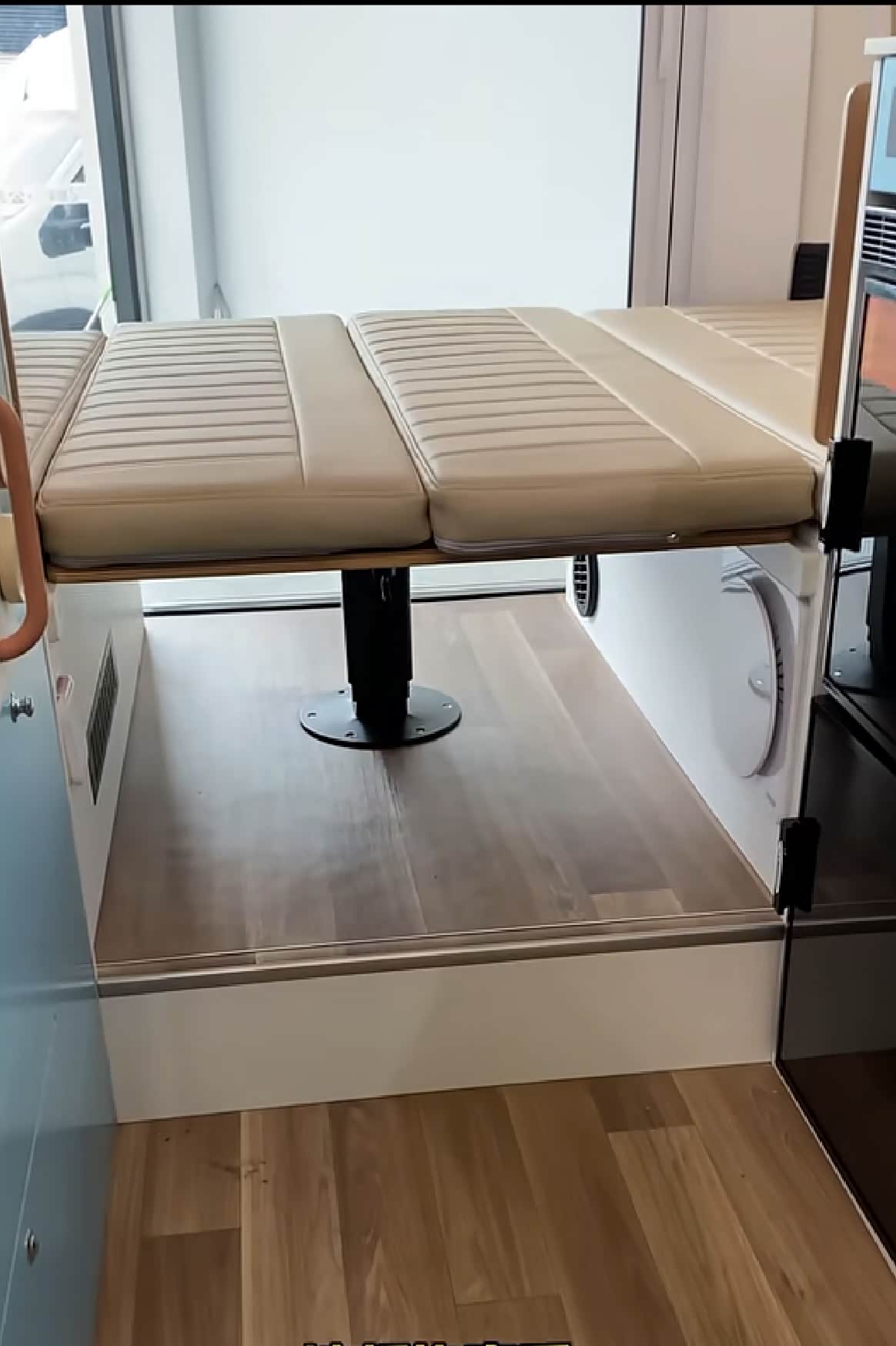 我太喜欢这个车尾卡座,还有纱窗,来个露台,全景通透客厅,没有了B车的挤压感。一人出游完全不需要卡座拼床,两人出游还是每人一床。卡座的桌子采用翻折平角链设计,前后左右上下移动,还可以360度旋转,卡座侧向两侧都装有翻折桌,为设计者点赞。