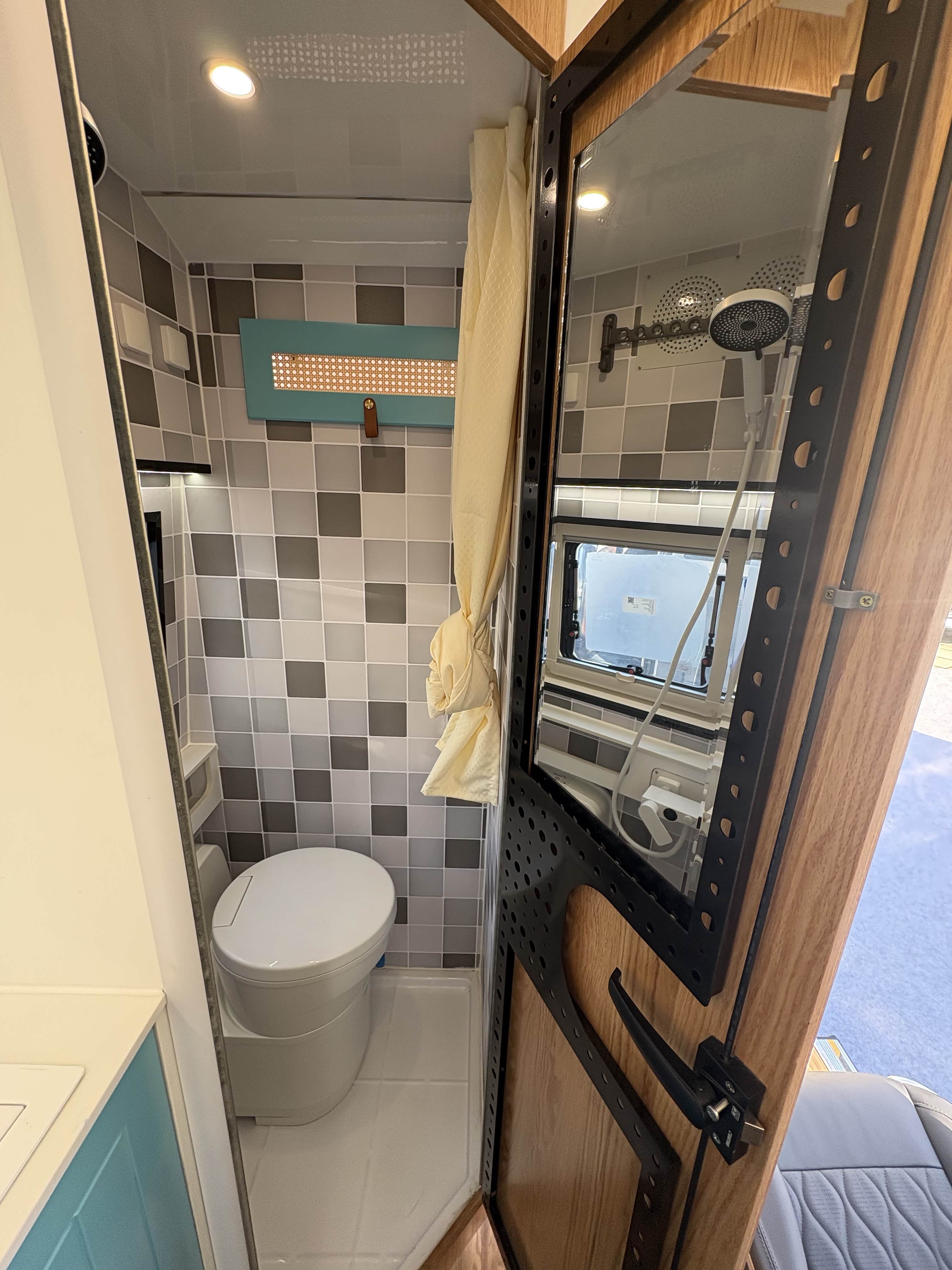卫生间外侧底部配了翻折桌,顶部洞洞板,非常好地利用了空间。房车空间非常珍贵,把空间用到了极致,进门可以挂一下外套…来看看卫生间里面: