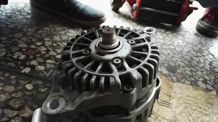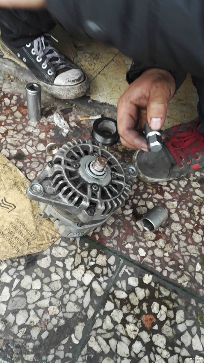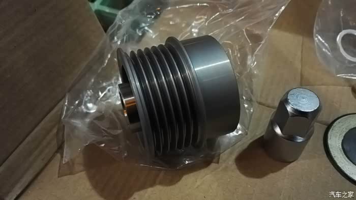 果然还是要工具得力,有风炮套筒工具根本用不着管钳,用手握紧皮带轮,两下就拆下了皮带轮螺丝(因为风炮有爆发力,估计原厂安装也是用的风炮安装,所以手工卸很困难);一开始小工安装没经验,直接上oap轮根本吃不到螺丝固定不了,还以为型号不对,差点放弃,郁闷之极!立即与店家网上联系沟通,店家说不可能,因为店里有同款发电机,做过实际测试的,可以改装使用。于是找原因,路边店的师傅也过来了,发现原来原车皮带轮与发电机之间还有个比较厚的垫圈片,把发电机皮带轮头朝下摇一摇就出来了,拆下这个垫圈片就可以吃到螺丝固定安装oap单向轮了。