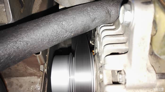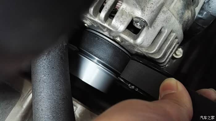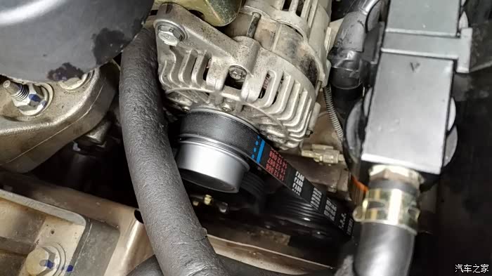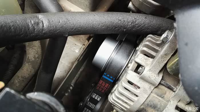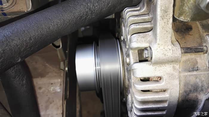 动手安装,一开始打算自己安装,找单位水电工借了把大水管钳,拆下皮带,用管钳固定住皮带轮,然后用套筒扳手去拆卸皮带轮螺丝,也许是一个人操作使不上力,根本卸不动那颗螺丝(原车皮带轮上都被管钳齿咬出几个缺口了),晕。还是去找平常做保养的那家路边店,花点钱弄算了。他那里工具齐全,有风炮套筒工具,弄这个不在话下。因为风炮套筒较长,在机舱内没有位置操作,所以必须拆下发电机来弄。
