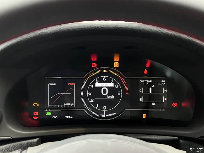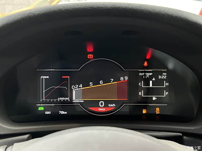 仪表变为全液晶仪表了,水温,油量显示独立在右边区域,左边区域显示车辆信息,油温电压,圈速计时器,曲线输出,G值表,油耗等功能调节。