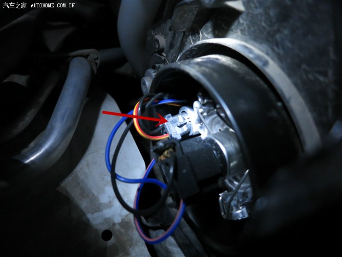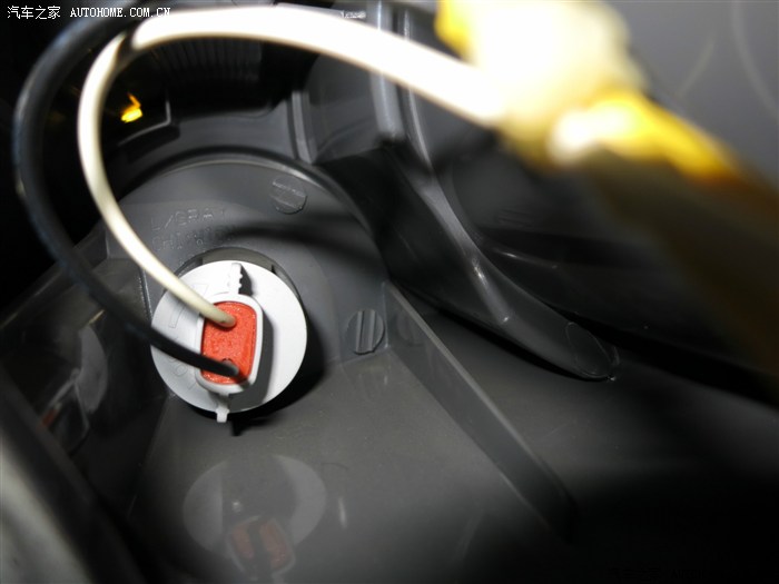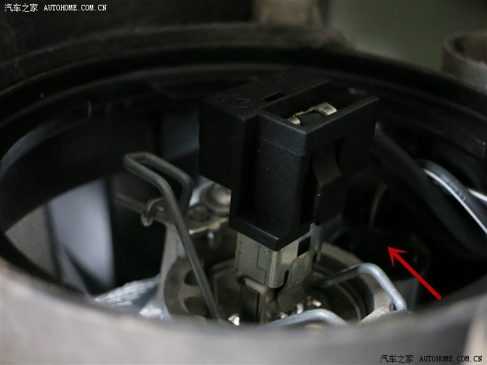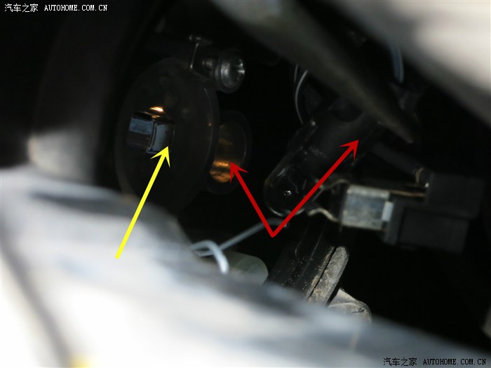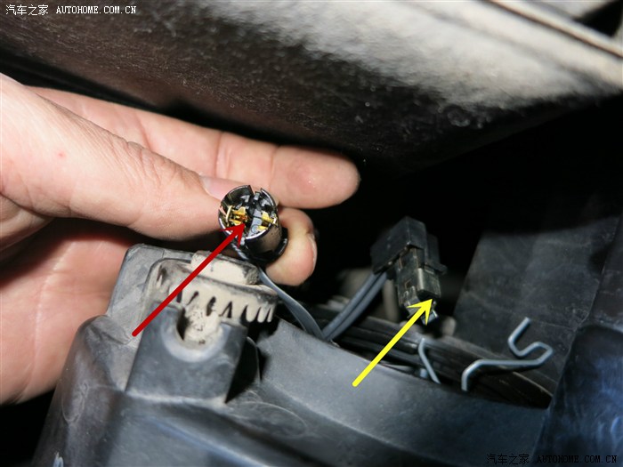 下面开始安装示宽灯了,步骤是先把远光灯给拆下来,然后才能更好的拆下示宽灯座,可以用一把尖嘴钳就能轻松的把示宽灯灯座拔下,红色箭头处就是示宽灯。