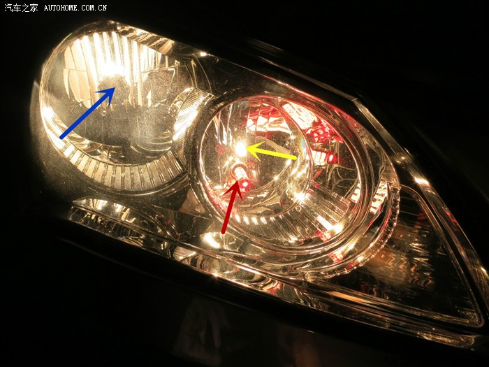 黄色箭头为远光灯位置,红色箭头为示宽灯位置。