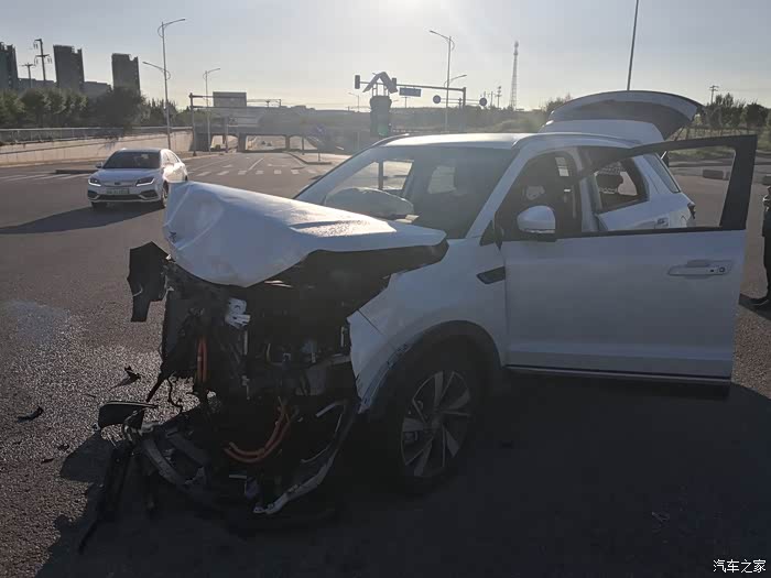 赶到现场,看到这惨状,心里一惊,大人孩子没头破血流,心里算踏实了。看了眼车,A柱完好,车内空间无溃缩,不幸中的万幸。对方北汽eu260,也挺硬,B柱凹陷,但车身还好,好在副驾没坐人,驾驶员也没大事