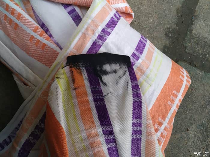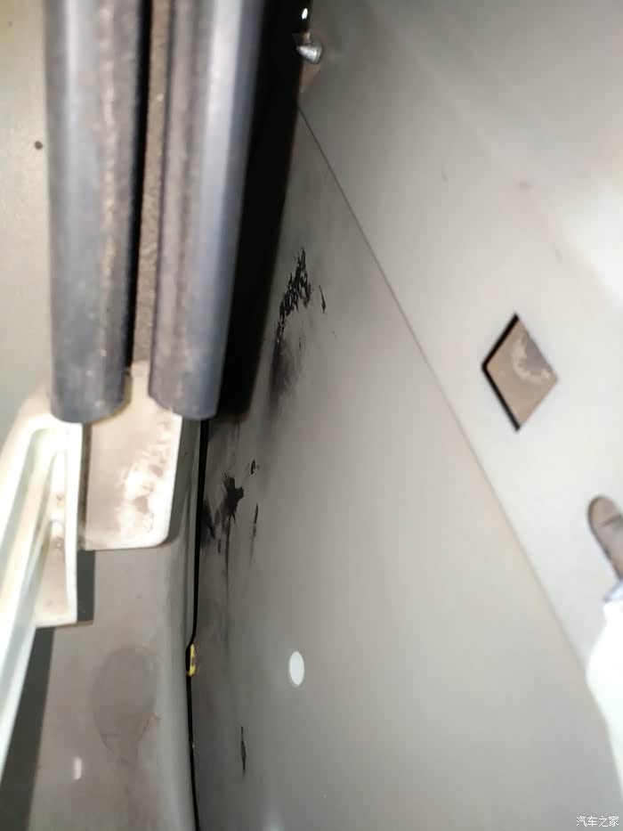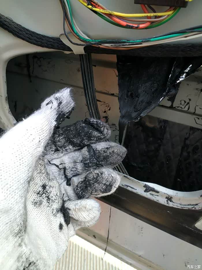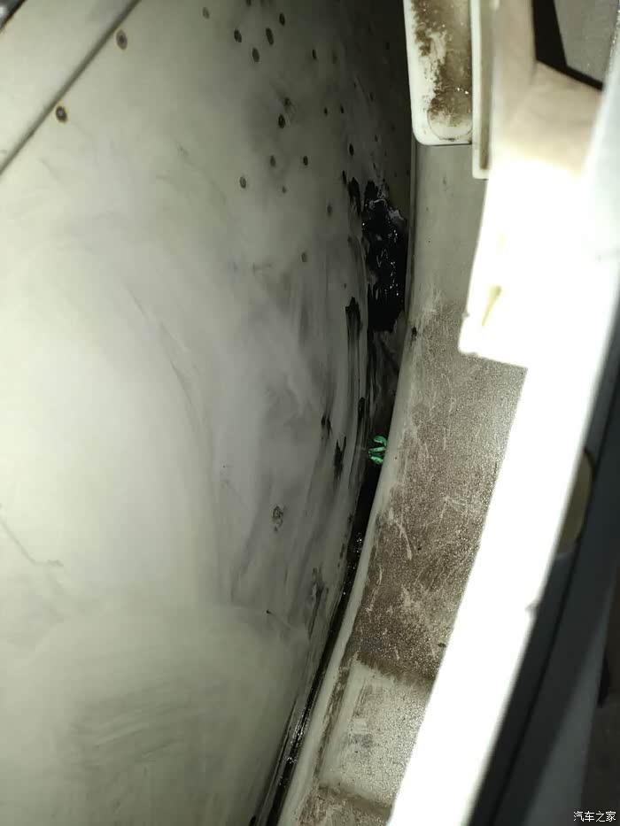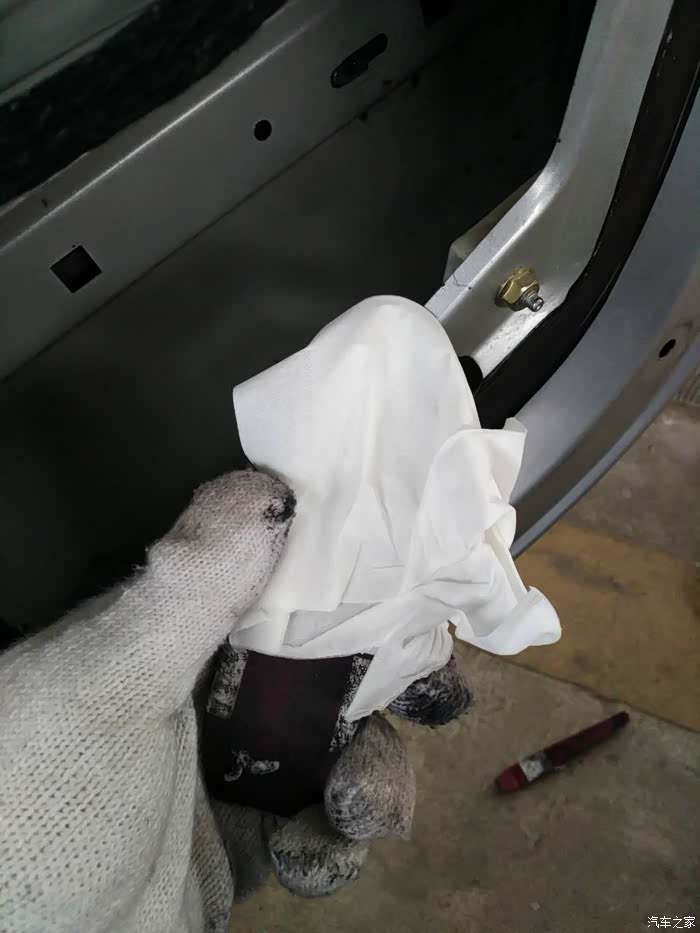 内层局部用清洗剂清洗后,再用布擦掉,擦完的布不能再用,必须扔掉,否则,会把上面液态的黑色胶又带回到车门上。