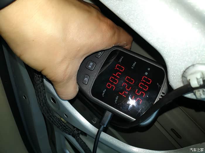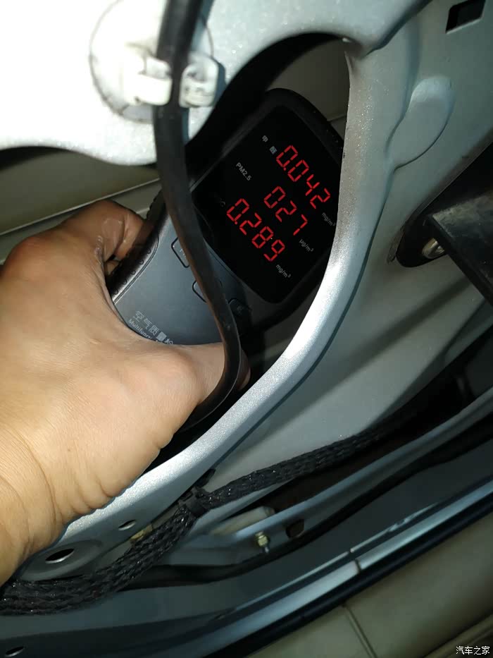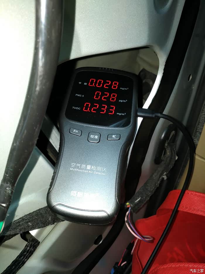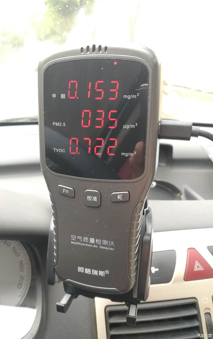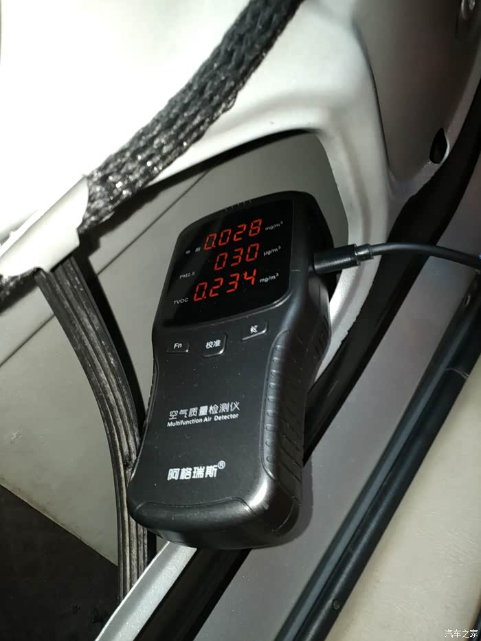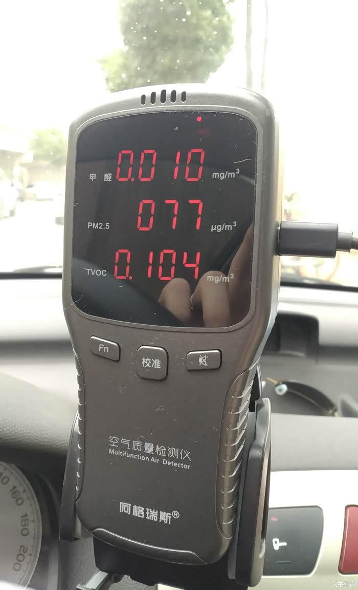 将车停湖边,开窗通风5分钟左右。检测仪第三行的总挥发物初始值:0.104mg/L,不超过0.600mg/L为健康。