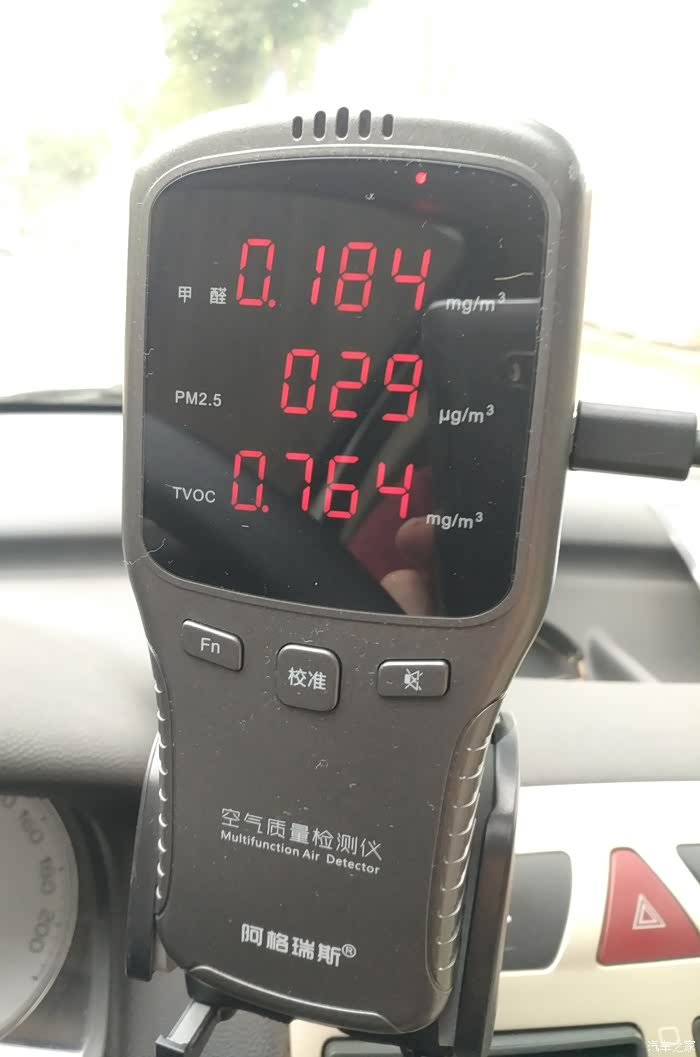 关窗密闭,室温在30度左右(坐车里等真热啊),25分钟左右,总挥发物上上升到0.722mg/L,略微超标。大概在5分钟前,也就是关窗第20分钟左右,达到0.600mg/L的。