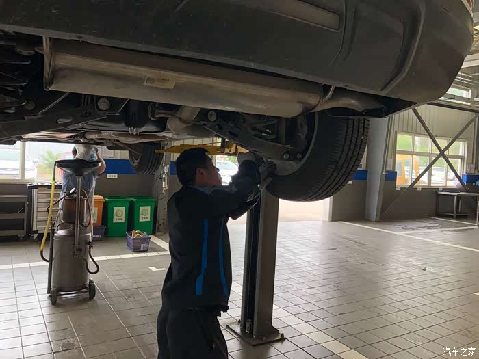 一边放油一边检查轮胎底盘,我也凑近看了下,探界者的底盘件都比较粗壮,看着就很结实放心