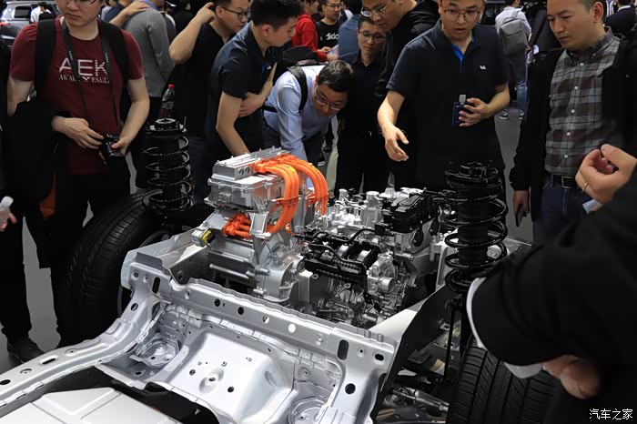 这是2019年我在上海车展理想展台拍摄的理想ONE的三电系统,这是前桥部分:前驱电机,增程器及控制系统