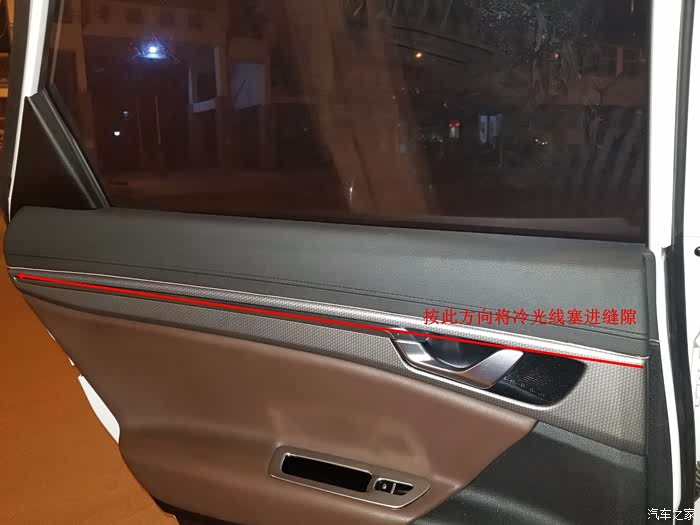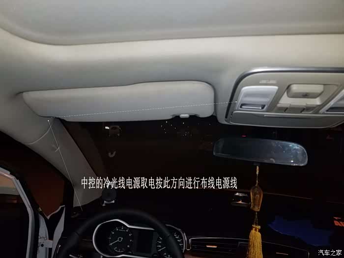 中控冷光线电源是穿过A柱从顶棚室内灯内取的电,与天幕冷光线取电方式一样。