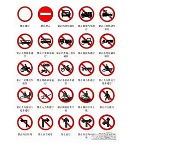共43种,设置在需要禁止或限制车辆、行人交通行为的路段或交叉口附近,起到禁止某种行为的作用。