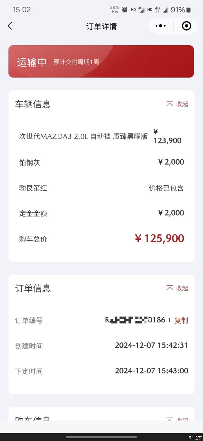 第一次和销售谈价格,我有马自达的大客户补贴所以价格能优惠3000,给我第一次报价是12.5w落地含利息,只选装黑曜红内饰(1000元选装包),没加车漆,去4s店谈价格的时候最后谈到的12.2w含利息,铂钢灰加2000元,选定配置是铂钢灰黑曜2.0