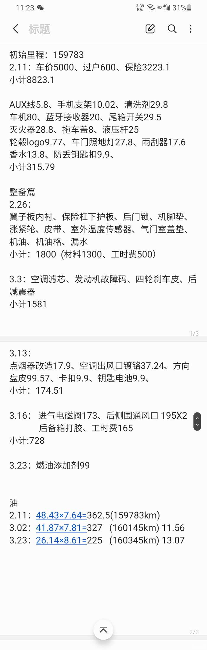 关于油耗:这车油耗奇高,实际13L/100km,按现在的油价折下来1公里1块1,好在动力不错,市区里面开完全够了,也试过60~80提速的小小推背感,算是满意的了;买了燃油宝五瓶一个疗程的目前只加了第一瓶,行车电脑显示油耗从原来的11.8变成12了,不降反升。也不知道这玩意是不是智商税。问了修车师傅能不能打吊瓶,他说考虑到里程和年份比较久,打吊瓶担心积碳堵塞管路。