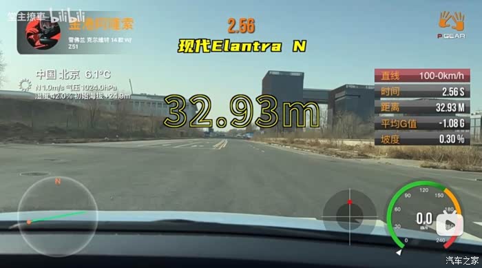 然后是100km/h到0的刹停距离,这一局依旧是伊兰特N获胜。