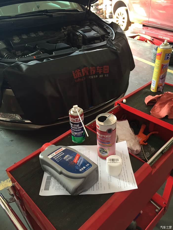 原车固特异轮胎已经3年7万公里了,虽然胎纹还很深,但两条前轮已经开始起皮,为了安全这次4条全部更换,20号下单轮胎、刹车油、进气系统和节气门清洗,22号接到短信通知配件已经到店,由于最近比较忙一直拖到25号才去工厂店施工,轮胎选择了性价比极高的普利司通泰然者T001,3万公里在4S店更换过刹车油,这次选择了大家用得比较多的博世刹车油,由于之前开空调挂N档发动机有抖动,准备用3M挂吊瓶清洗进气系统和手工清洗节气门。