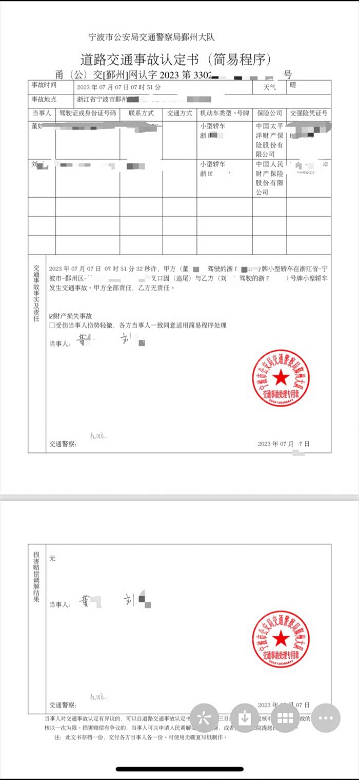 然后就报警说明事故地点和事故情况,交警通过摄像头确认了事故现场,远程让我跟对方司机沟通责任问题,对方确定可以承担全责后就可以挪车到路边了,再就是根据交警引导在线上开具事故责任书,流程也很简单,上传事故照片、双方行驶证、驾驶证后,再线上对事故责任书进行签字就完成咯,最后跟对方司机互留了电话后就可以开去4S维修了
