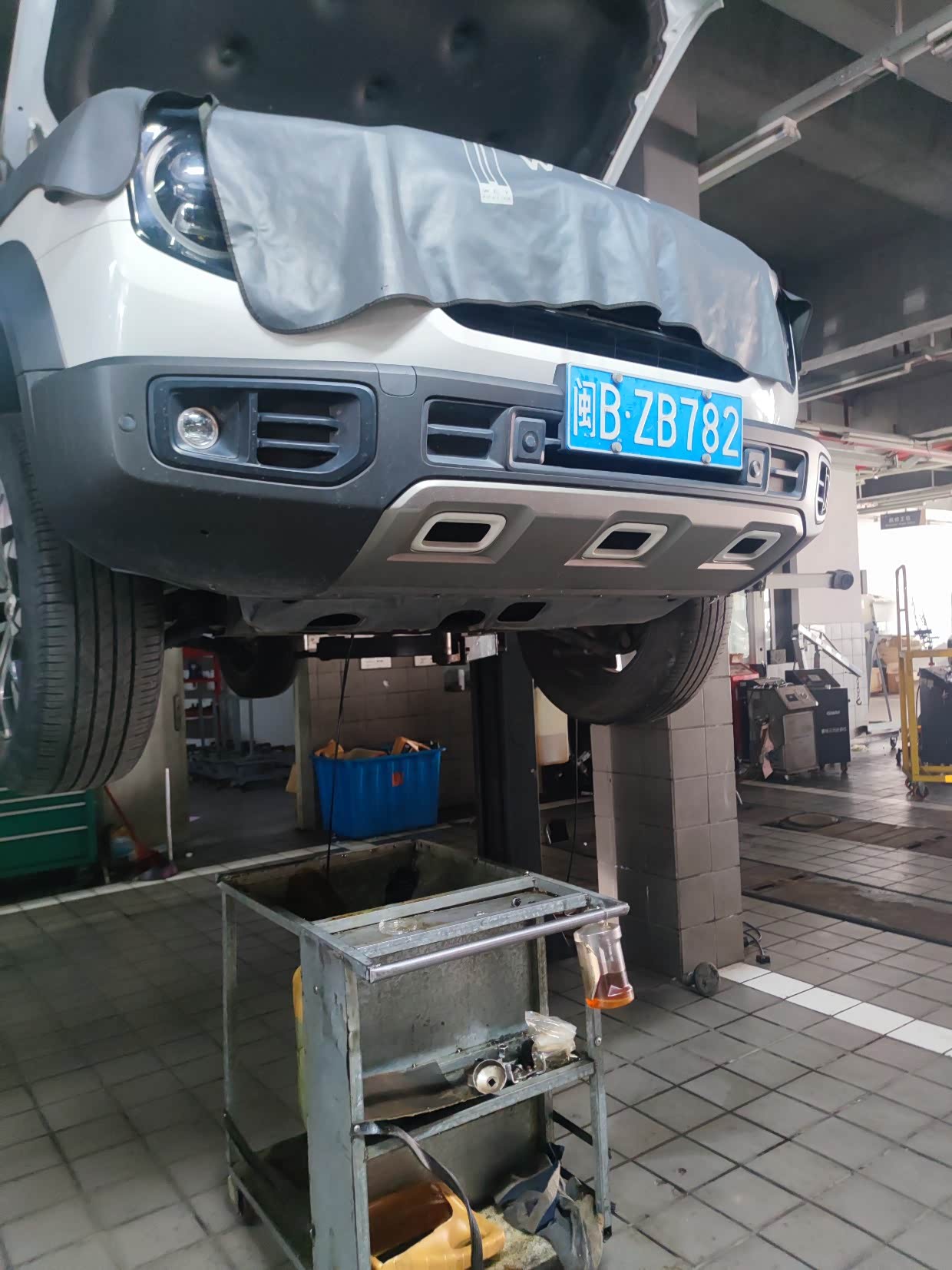 下一步,师傅升举车子, 为 更换机油作准备。