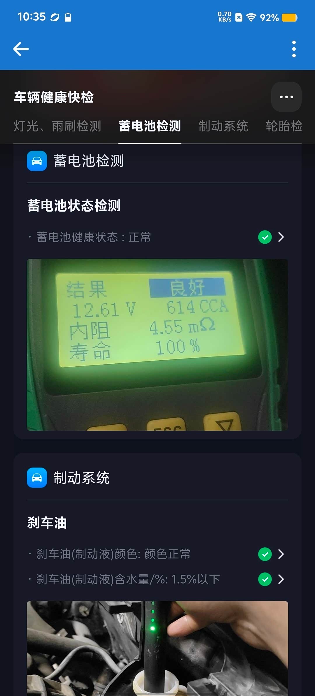 最后检查蓄电池健康度,结果显示良好;检查刹车油,正常。保养项目还是 很到位。