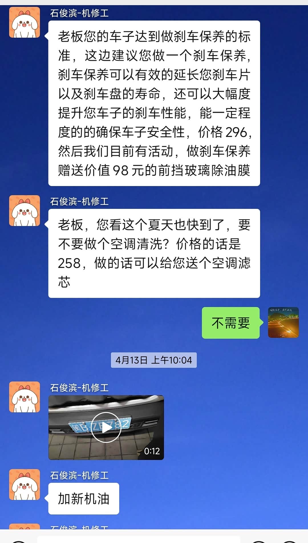 师傅在做保养时也会推荐一些收费项目,如刹车保养,空调保养。我都拒绝 了。不能说这些保养没用,但是,我的车还不需要。