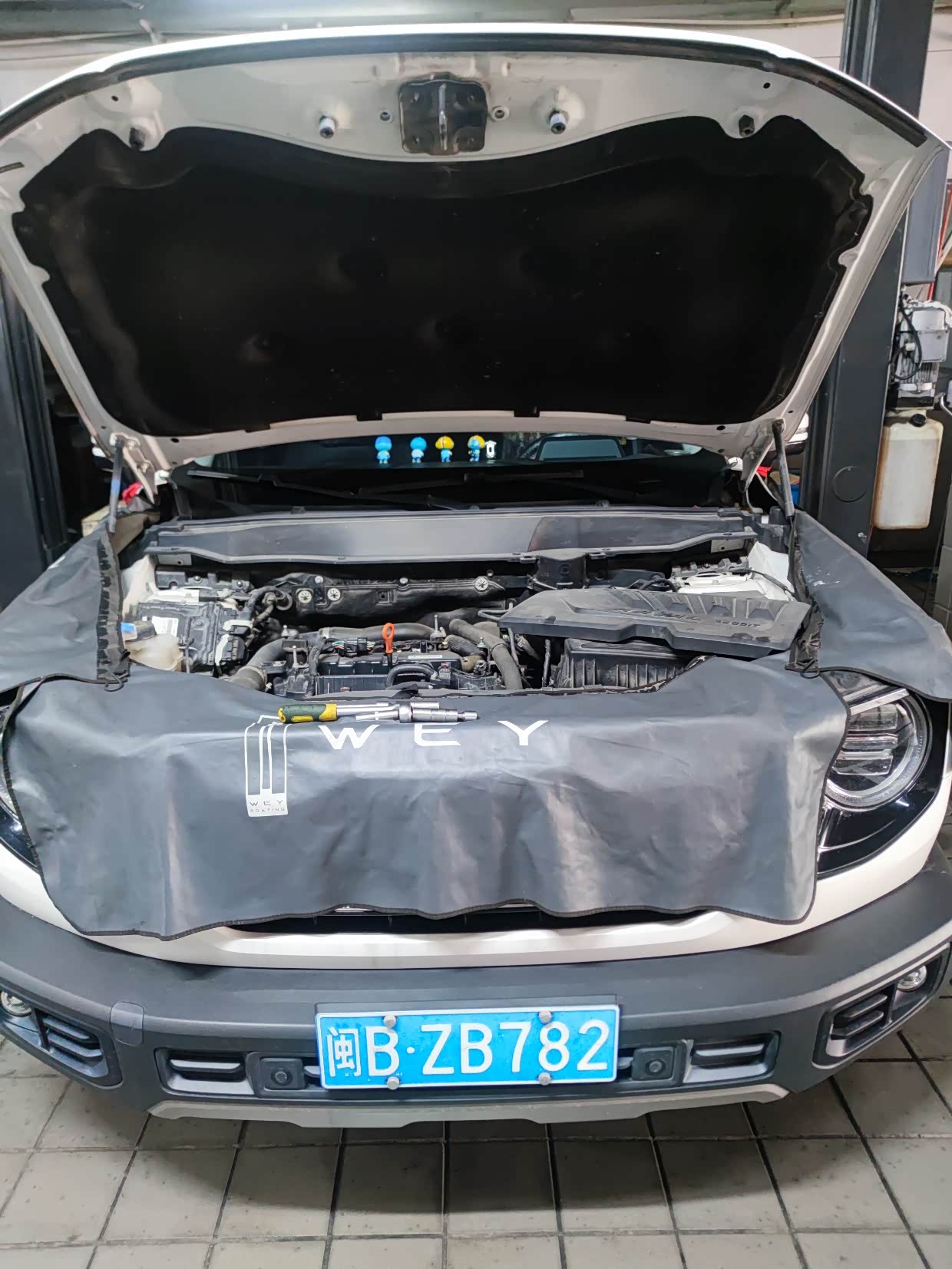 首先打开引擎盖,在边上铺上防护垫子。