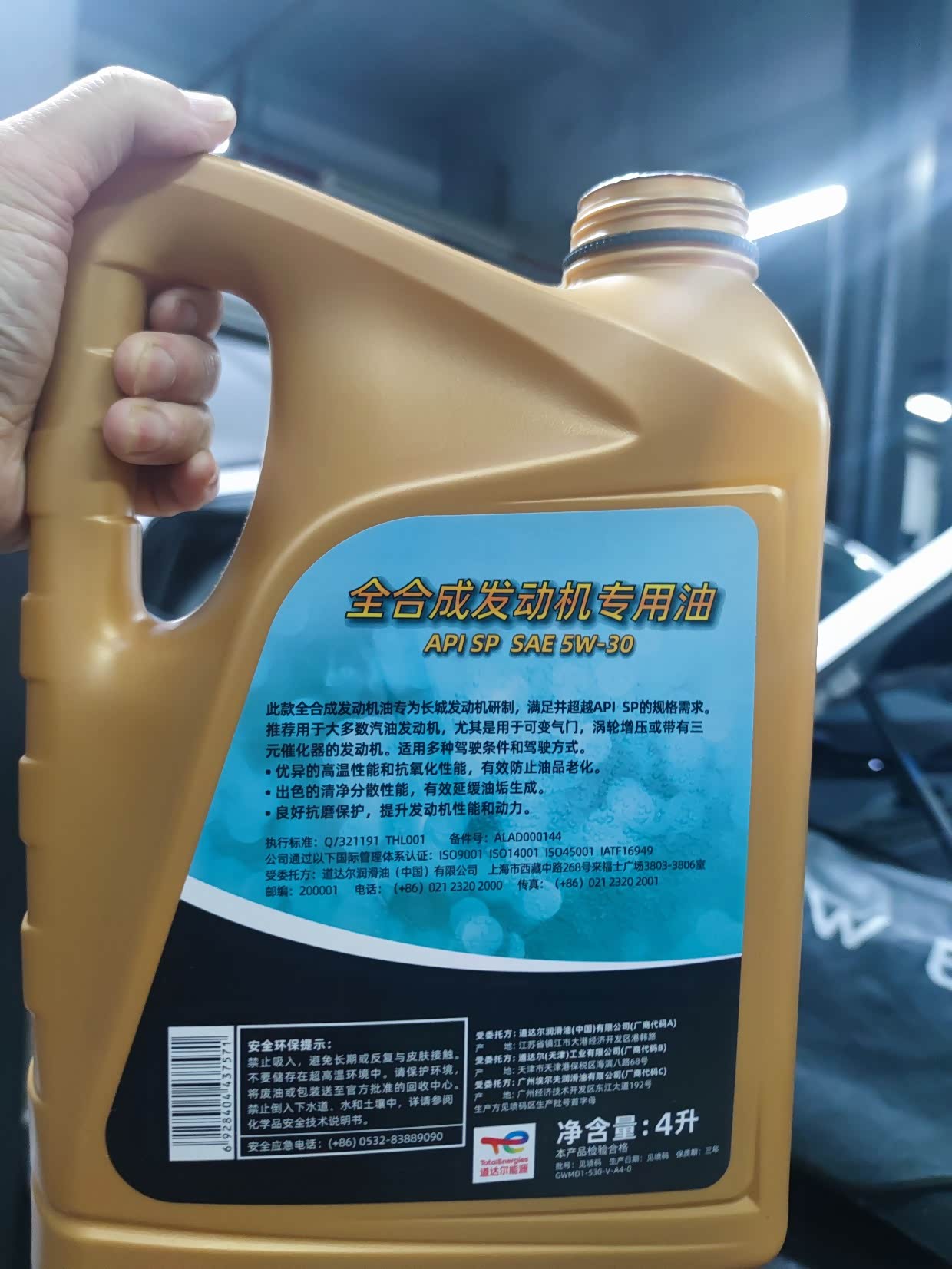 下一道工序就是 添加新机油。大狗的机油是长城汽车定做的道达尔全合成机油。5W-30, 4升。它专为 哈弗1.5T发动机匹配的机油。