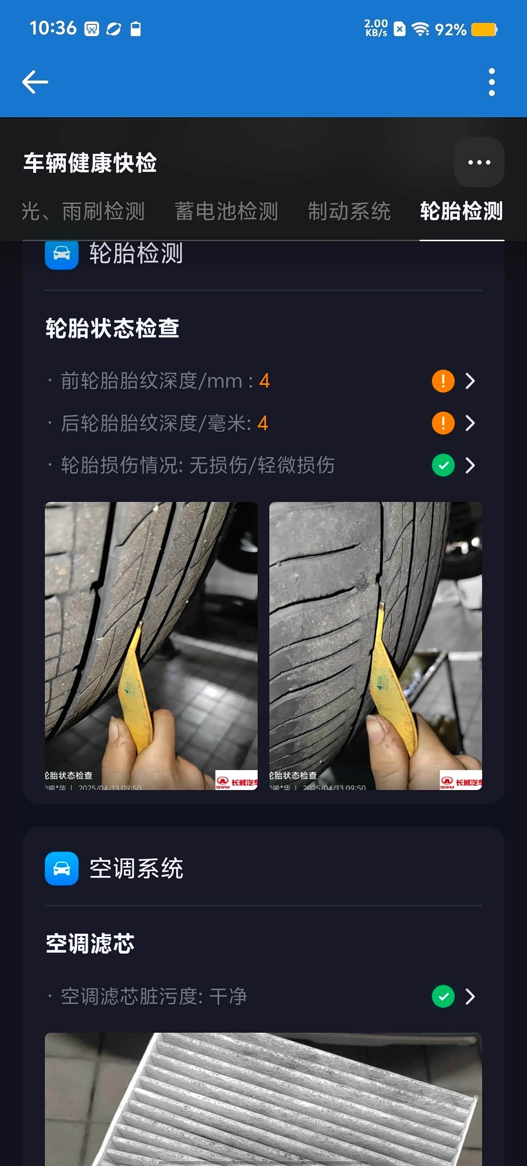 轮胎花纹深度只有4mm,快到警戒线了。快五年了,下次保养时要换轮胎了。师傅把空调滤芯和空气滤芯也吹干净了。