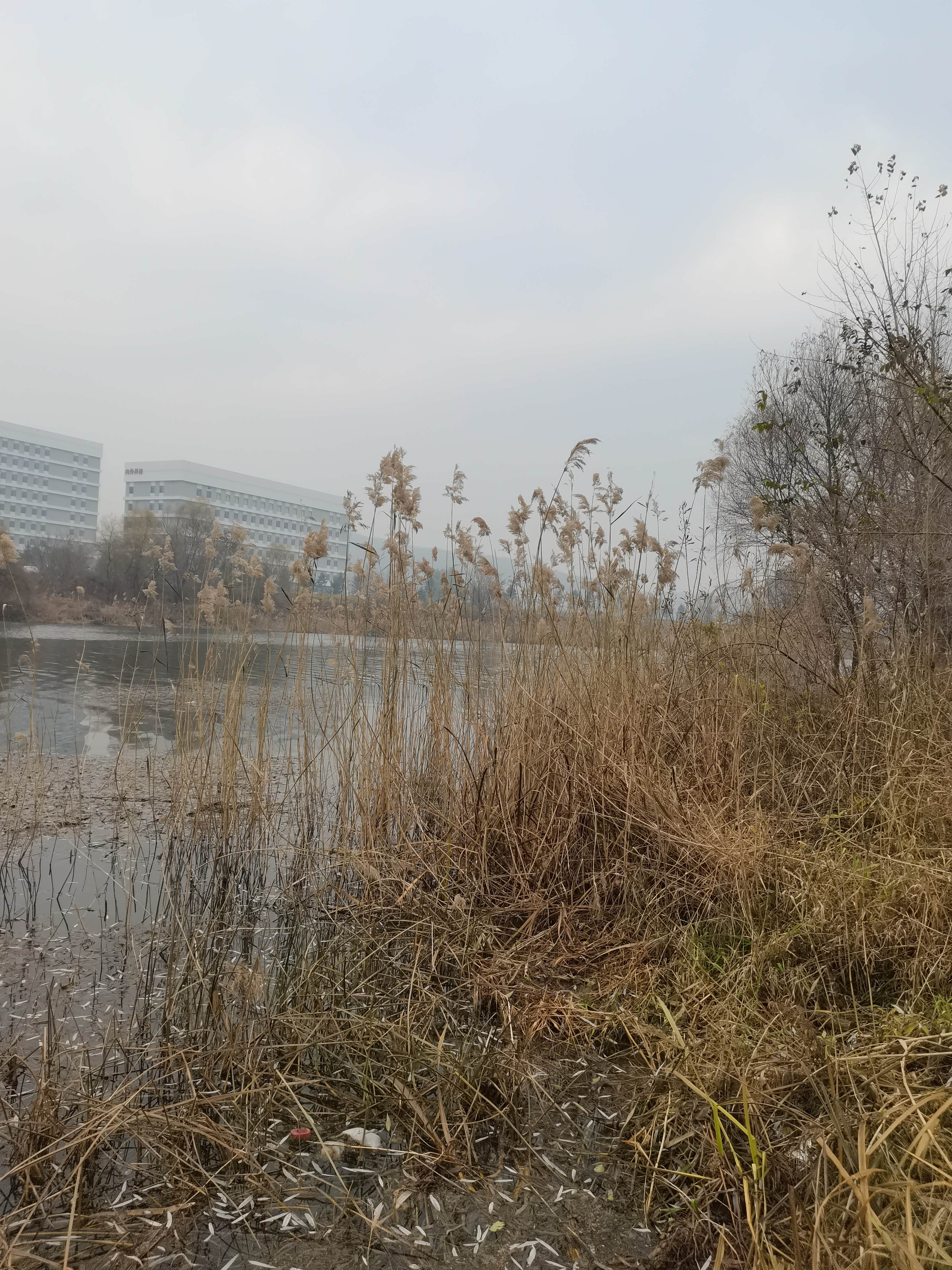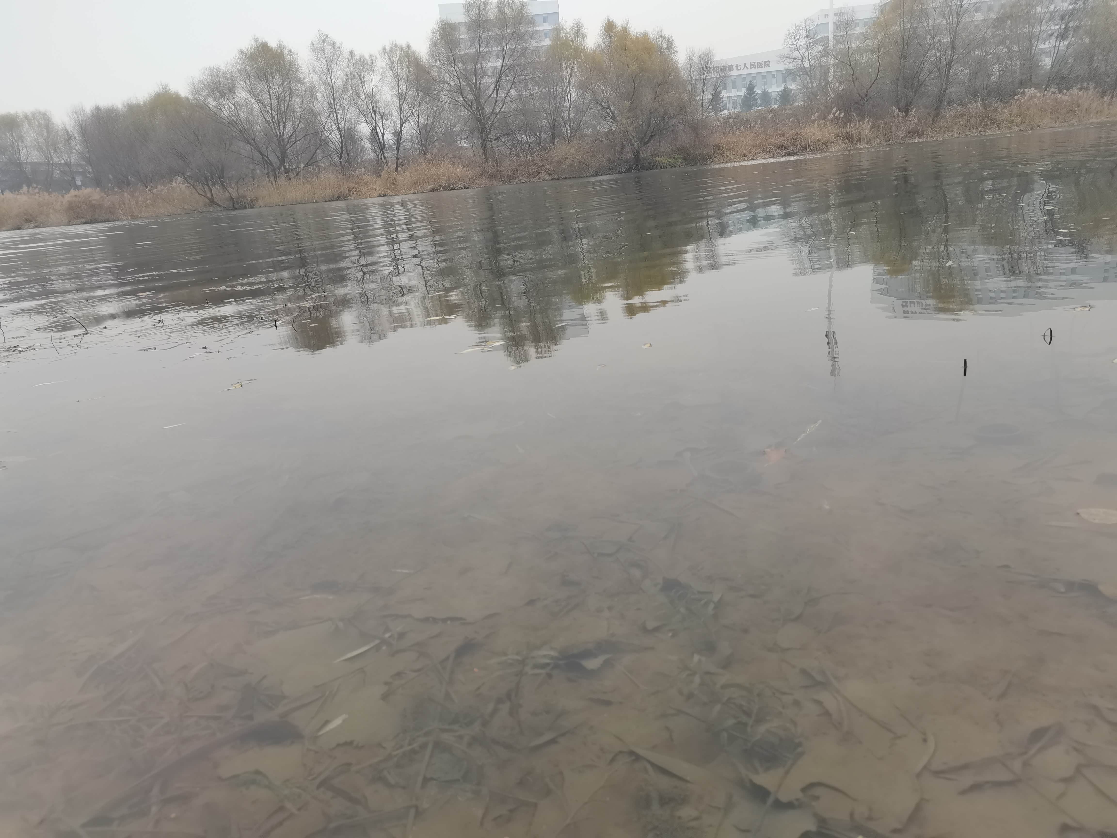 河的水面还未结冰,透过水能看到河底,水面清澈见底,随风轻摇、花絮纷飞的芦苇荡,倒映着白云的清澈水面,交织成一幅充满诗意的自然画卷。