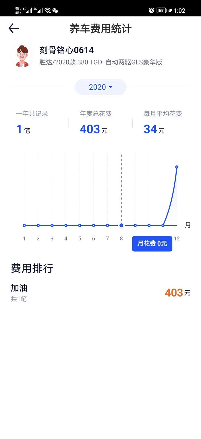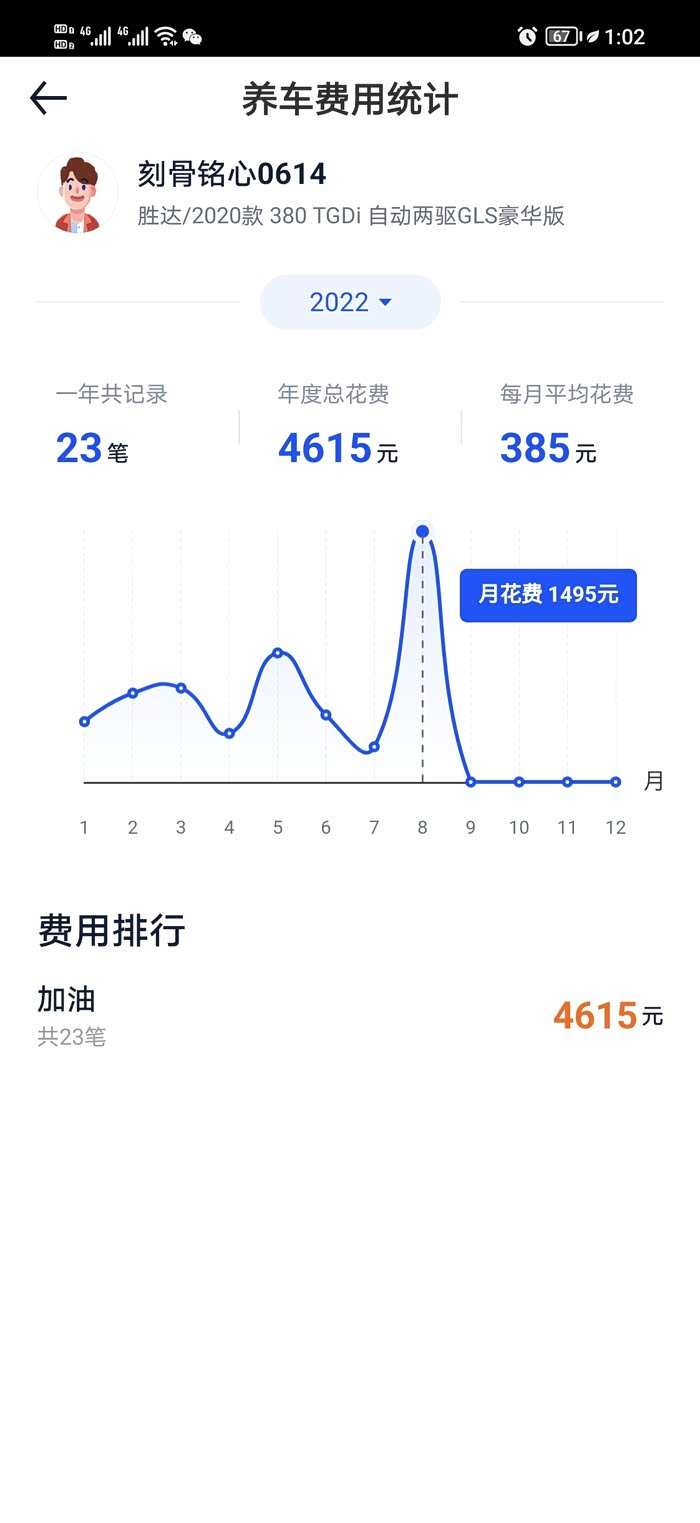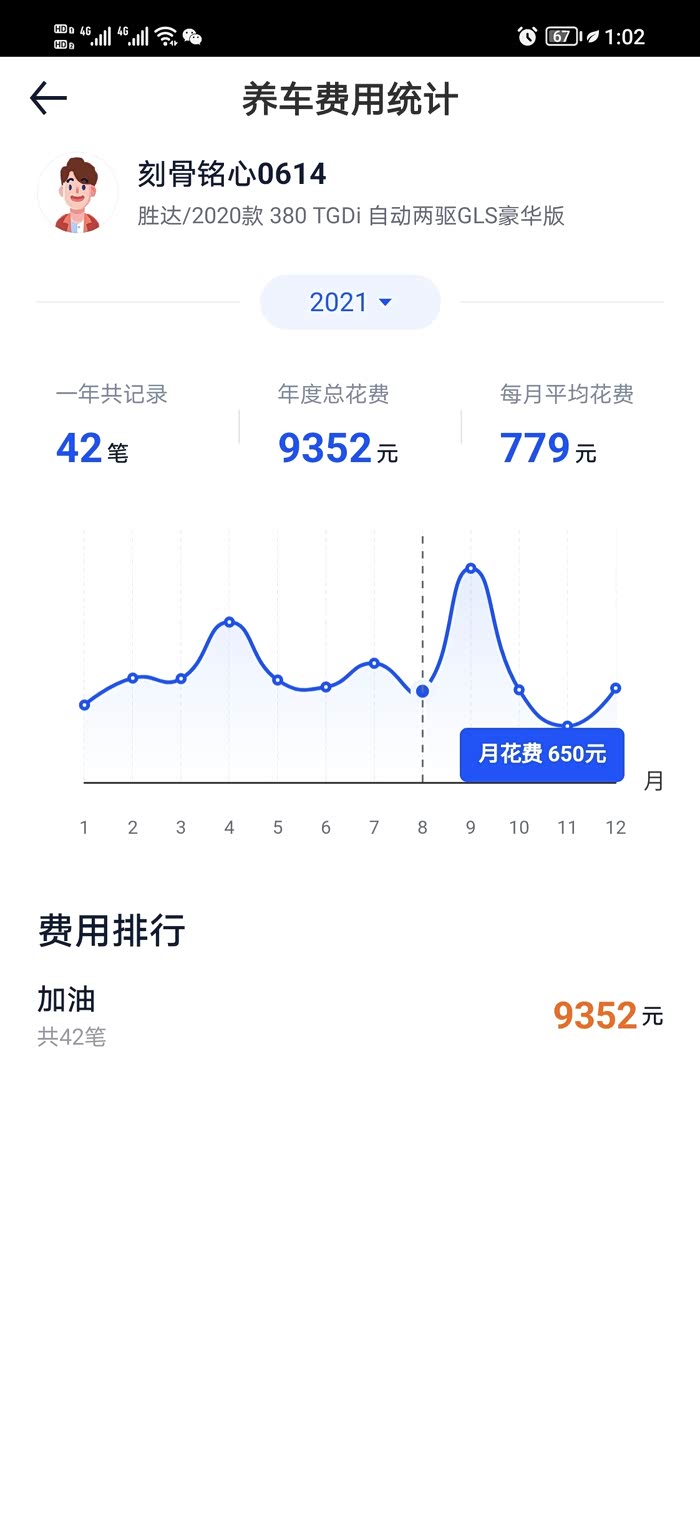 目前我的车一年半,总里程20700,总油费403+9352+4615=14370,目前车还是满油。