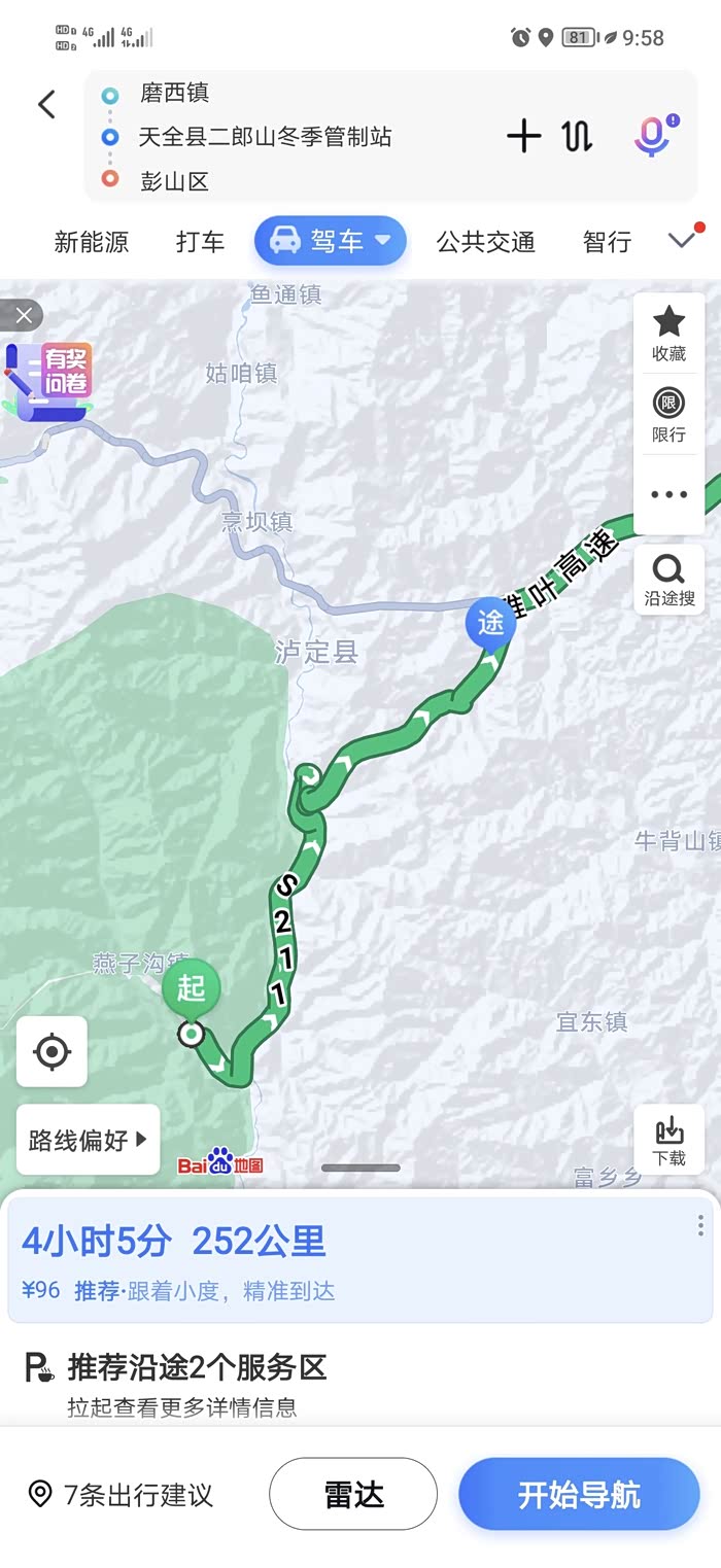 我们没有走常规路线经过泸定县上高速,我们翻越了二郎山,因为还想在山上找一条溪流,感受一下20℃的夏天,再回归40℃的家