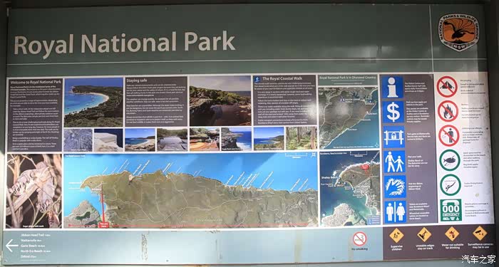 Bundeena小镇东南角是皇家国家公园的一个出入口,这里树立了一块公园游览示意图,提醒人们一些注意事项