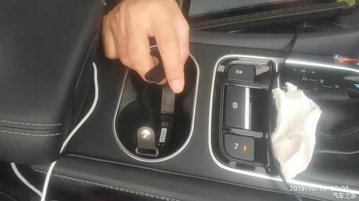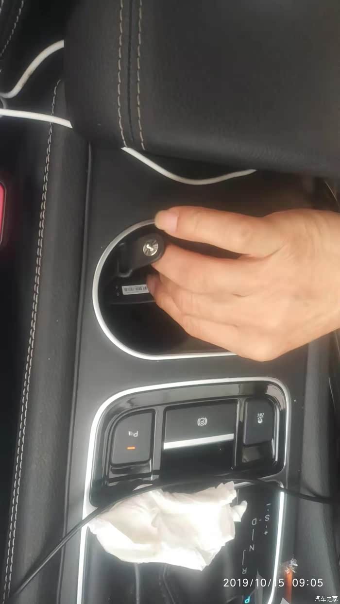 钥匙感应的地方在杯座下面,好像是靠副驾驶那边,要把里面的橡皮拿掉能看到一个标注