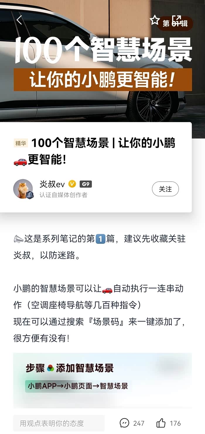 还有很多智慧场景,大家根据自己的需求,可以自己设定很多使用场景,也可以直接使用别人的。其实“智慧场景”的意思就是可以自行设置很多模式,让你更方便和车机互动,更简单的体验小鹏的科技和智能,达到“人车合一”。