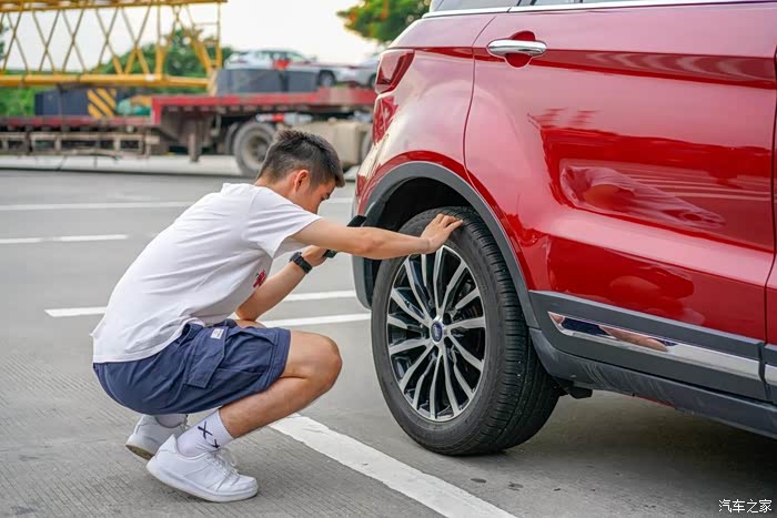 然后检查了轮胎的外表情况。