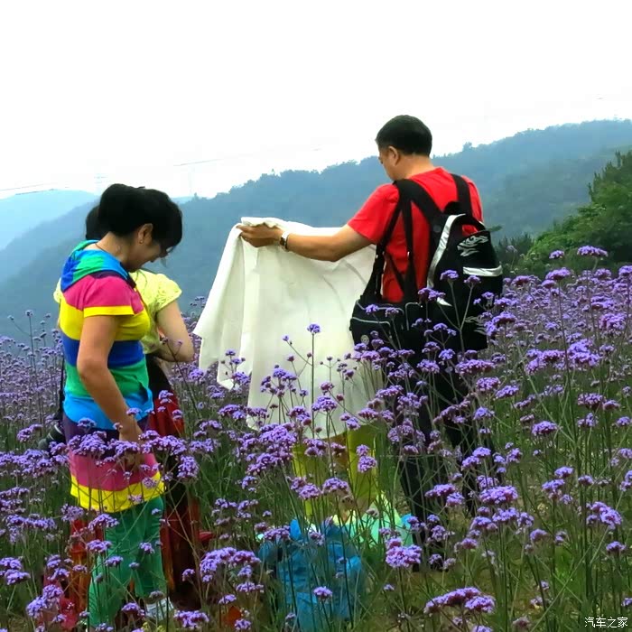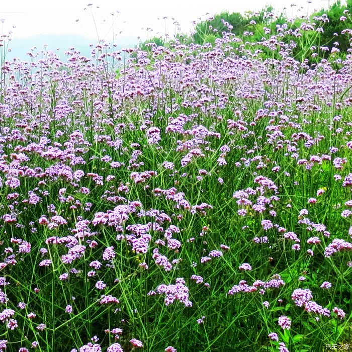 一大片一大片紫色的薰衣草铺盖在斜坡上,如波浪般起伏不休。除了一片紫色大地,还有占据整个山丘的满天星,一大片盛开的波斯菊、还有一些不知名的,构成一张深浅交错的彩色花毯。