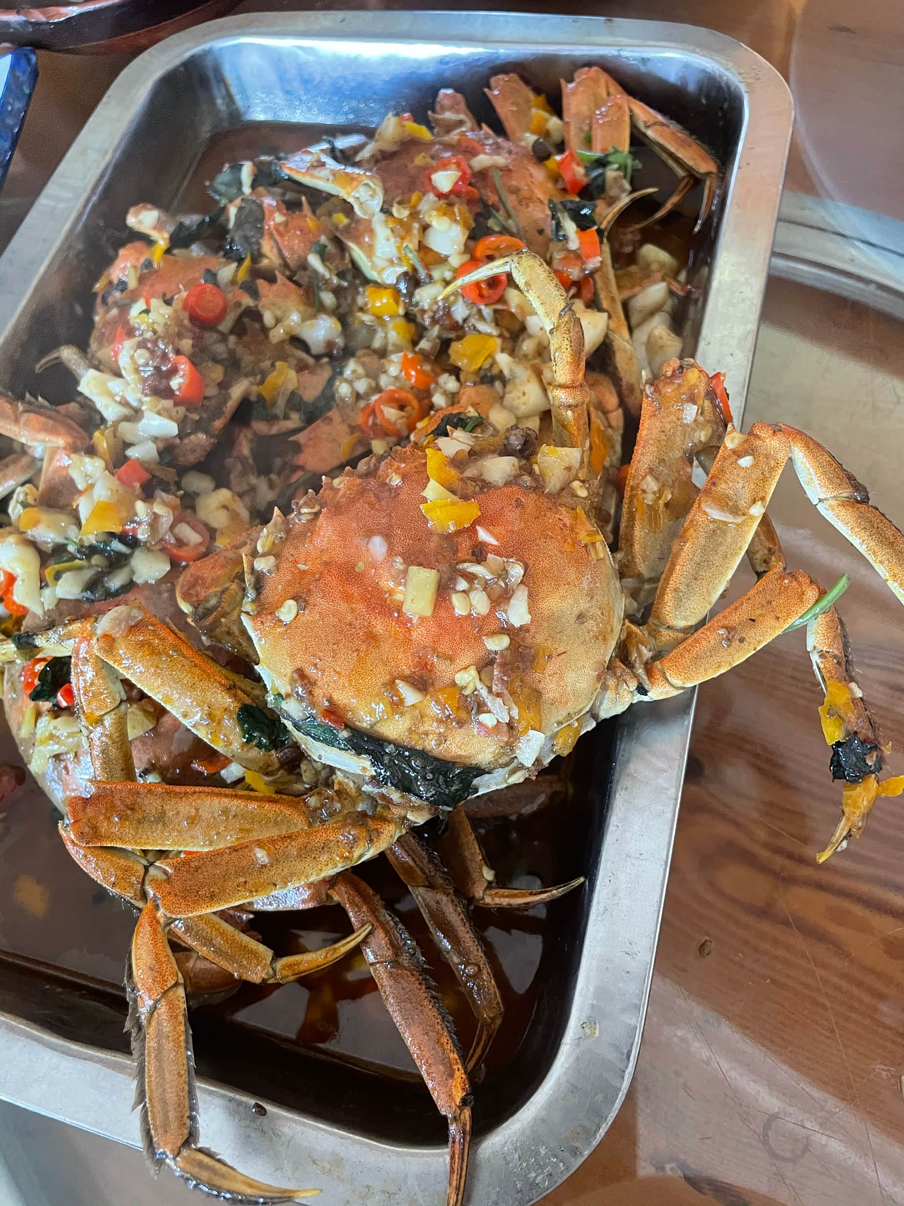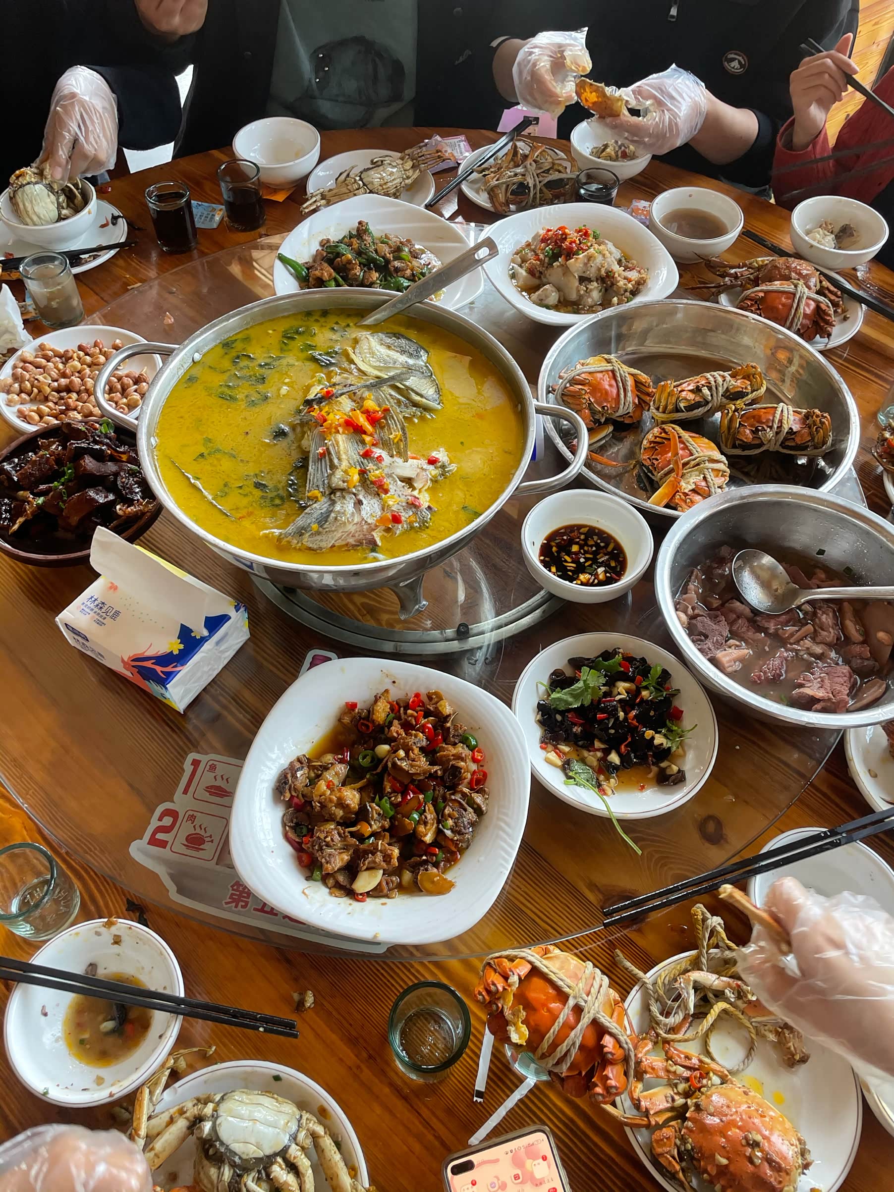 这么丰富的菜品啊,团购居然才1050块钱一桌。其中包含了3.5母的大螃蟹每人各两只,这个螃蟹就是38块钱一只,还有当地的特色菜10个包含了,酒水以及饮料,等等在长沙的话,这一桌菜,最起码要上了1500!