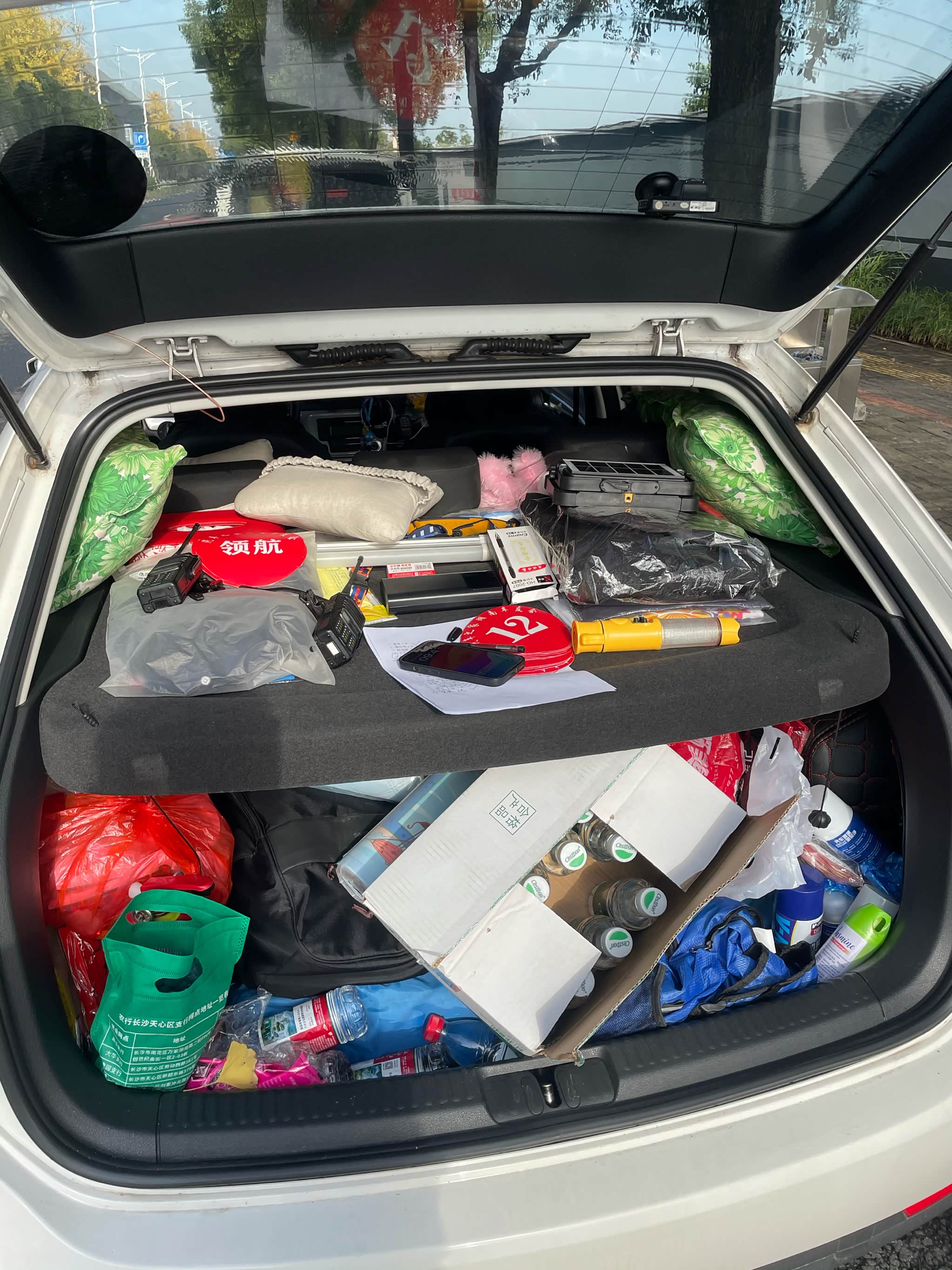会长他领航车辆里面塞满了各种的小物品啊,有对讲机有应急车灯,还有矿泉水毛巾,等等简直就是一个移动的百宝箱啊。