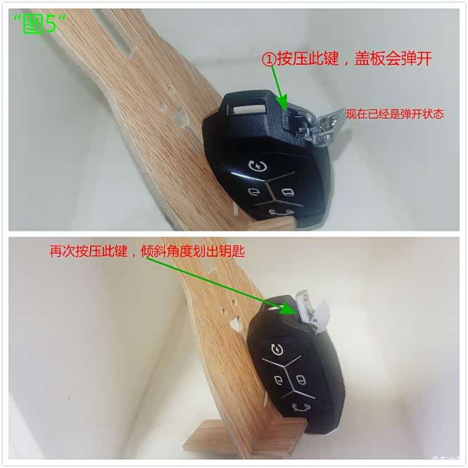 “图5”机械钥匙,当遥控钥匙发生没电的情况时,可以使用机械钥匙打开车门,方法为:按下“图2-1”释放键,“图2-1”钥匙盖卡扣会弹开,往上滑动翻转打开,然后在按下“图2-1”键倾斜角度,钥匙会自动划出。