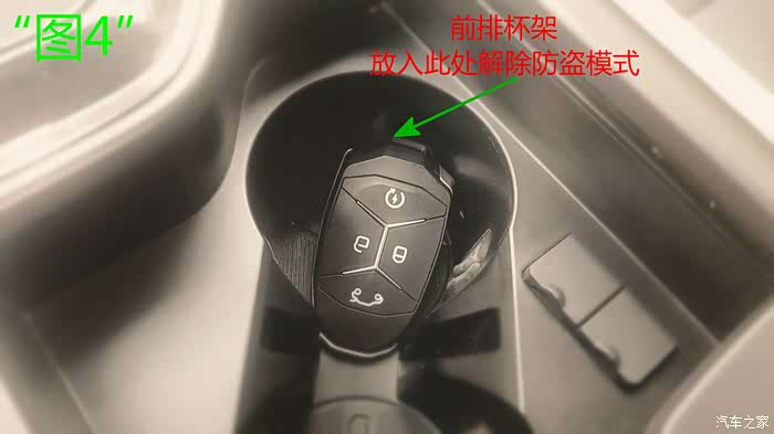 机械钥匙插口在驾驶员车门拉手内侧“图3”,插入钥匙顺时针旋转,即可解锁驾驶员车门,拔出钥匙,再次拉动车门拉手,即可打开车门。 当打开车门后,因车辆检测不到钥匙,车辆将进入防盗模式。将车钥匙放到杯托内“图4”,按下点火开关即可解除防盗模式。当在车内遥控钥匙没电时,也可使用相反顺序,使用机械钥匙锁住车门。