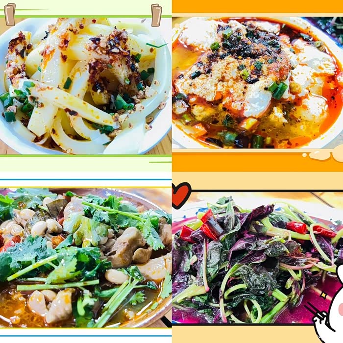 黄凉粉,口感细腻;荣昌豆花,鲜嫩可口;特色肥肠,肥而不腻,香气四溢;清爽的炒时蔬,荤素搭配。