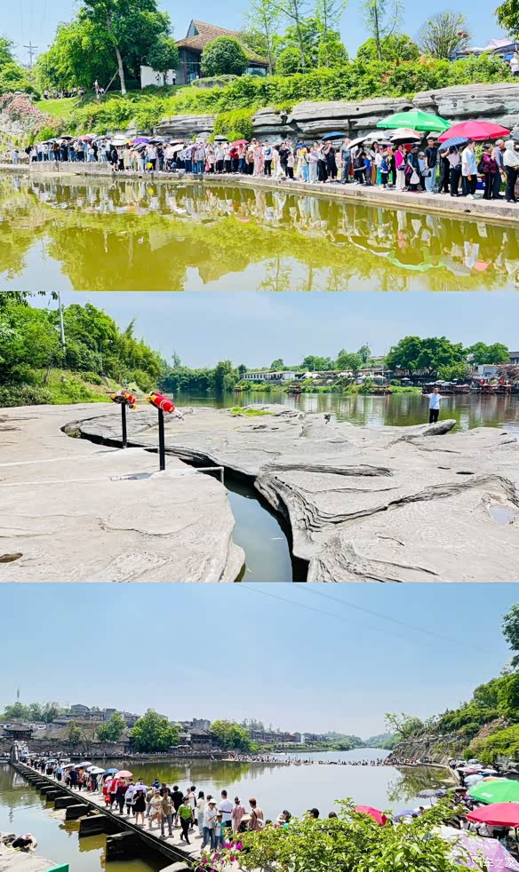 远看大荣桥上的游客盛况。古人在河岸一大片石板上凿出一条弯曲的水沟,不知道有何用途?