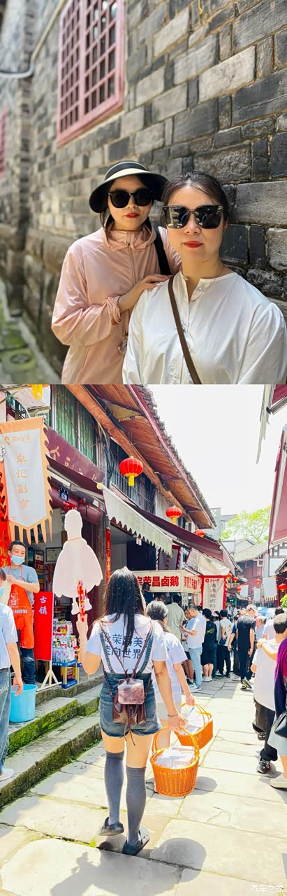 在这里,我们还遇到了两位提着竹篮、身着“让荣昌美食走向世界”白色T恤的姑娘,优雅地行走在古街上。