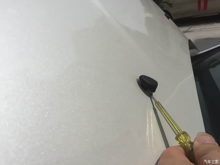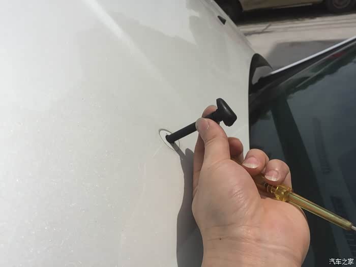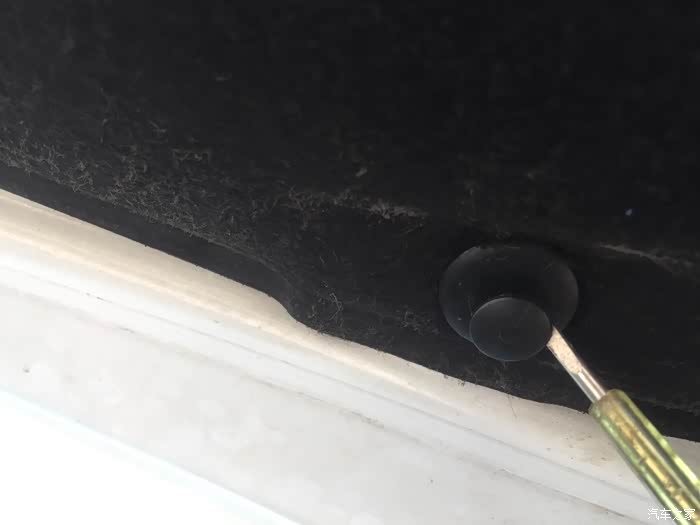 用一字螺丝刀挑出塑料铆钉头子,然后整个拔出!掀开隔热板!