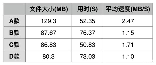A款速度最快,达到2.47MB/S。