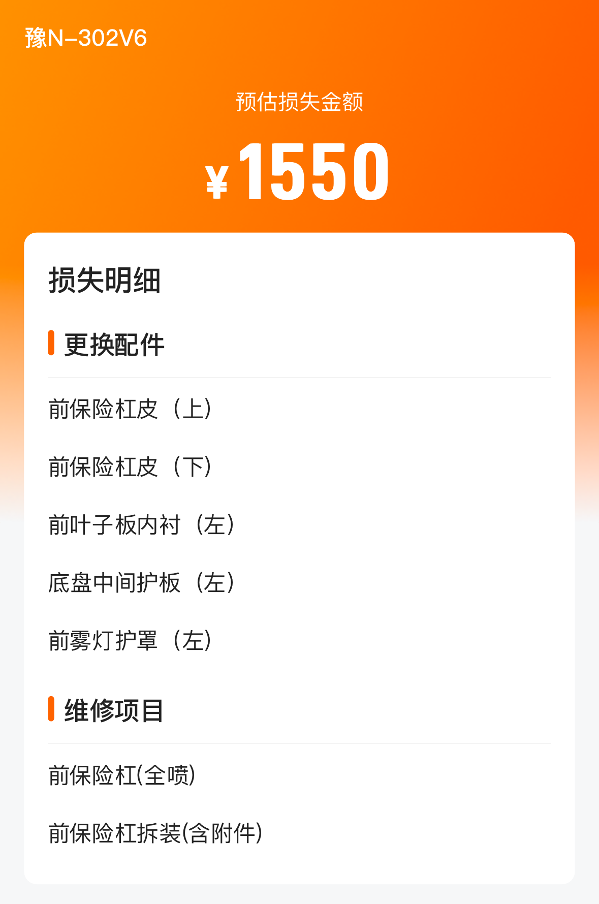 此次爱车维修,分别更换了上下前保险杠皮、左前叶子板内衬、左边底盘中间护板和左前雾灯护罩,并对新的前保险杠进行整面喷漆。整个维修过程耗时2个小时,维修价格包含工时费一共花费1550,并且皆有保险公司承担。