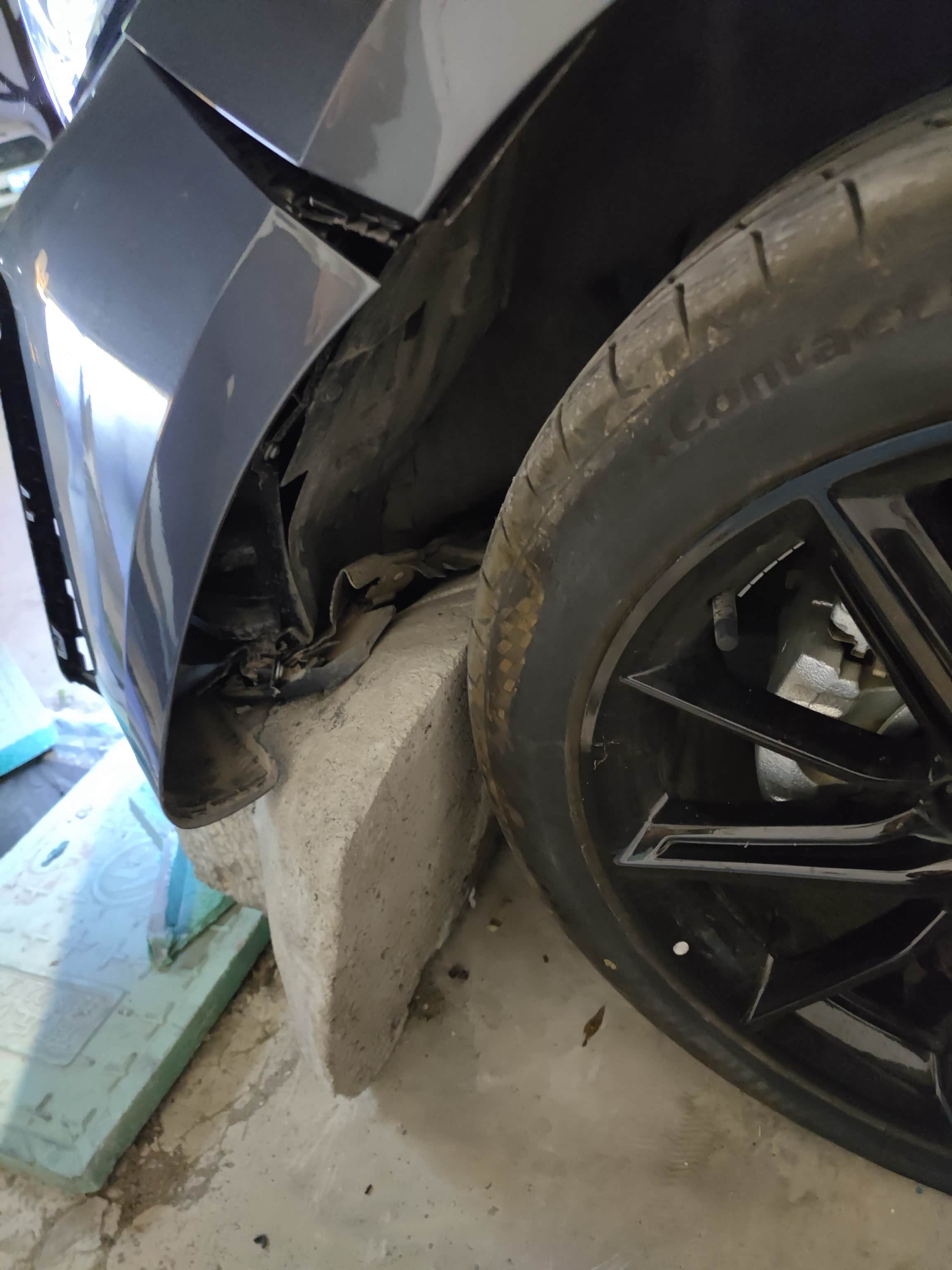 当我下车之后看到车子直勾勾的压上了一块大石头,整个石头卡在左前轮和挡泥板里面。于是我试着前进或后退,想把车子和石头分开,试了几次都以失败告终。思前想后,最终在轮胎后面垫上2块砖头,使得车子后退时能够起高一些,如此便把石头搞出来了,但我的爱车也因此受到不小的损伤。