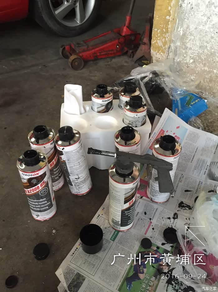 空瓶子,喷完9瓶发现其实应该再多买3瓶的。施工部位包括底盘和轮弧。轮弧喷汉高2000,底盘喷汉高3000