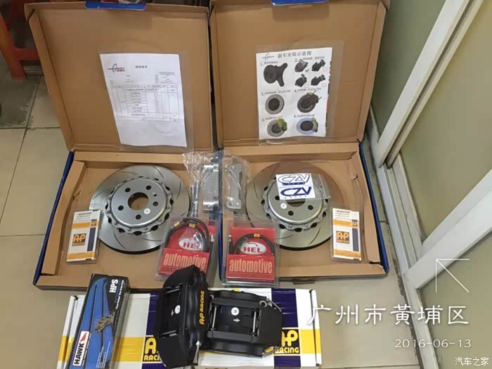 全套购自车质汇,AP卡钳、CZV刹车碟和桥马、HEL钢喉、HAWK刹车皮、MOTUL刹车油(DOT5.1)