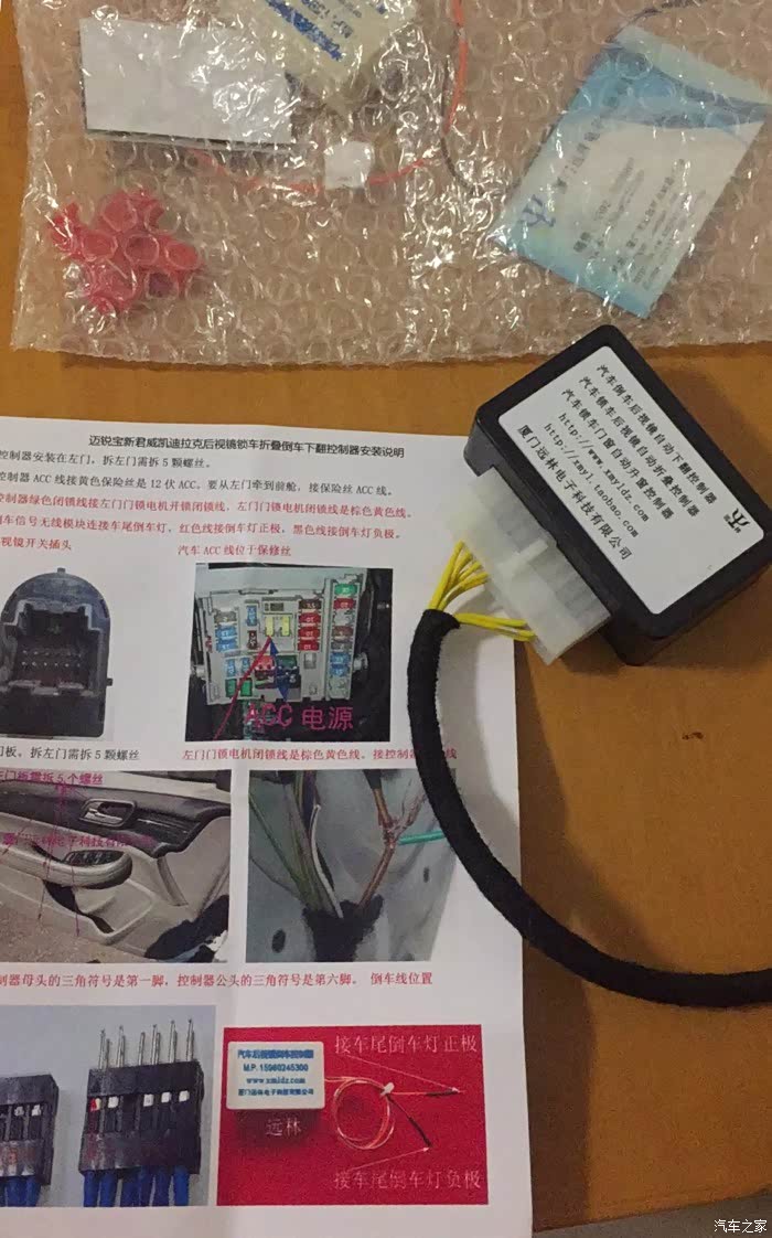 要在主驾门内安装一个控制器、后门刹车灯上安装一个信号发射器。因为是我自己一个人安装的,所以安装过程没有拍照。知道怎样拆车门的话可以自己装,不难。