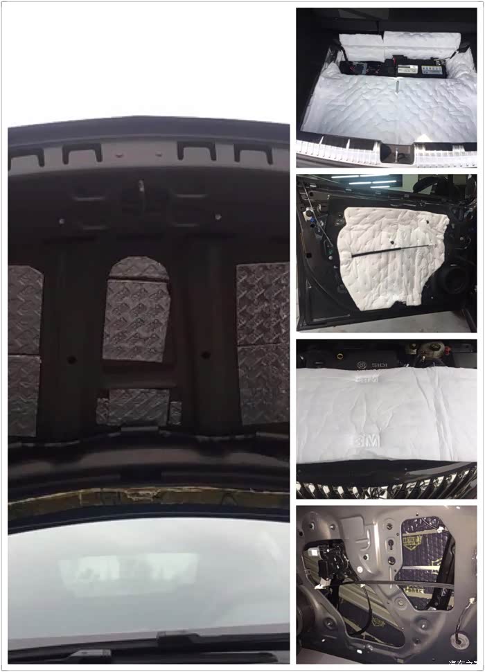 5、后备箱、四门、机盖、地板、四轮、后门止震和隔音。只拍了四门和后备箱的施工过程。约3000块,分别用了3M、静霸、静卫士、埃索等品牌的材料。最后才发现最贵的3M才是性价比最高的。